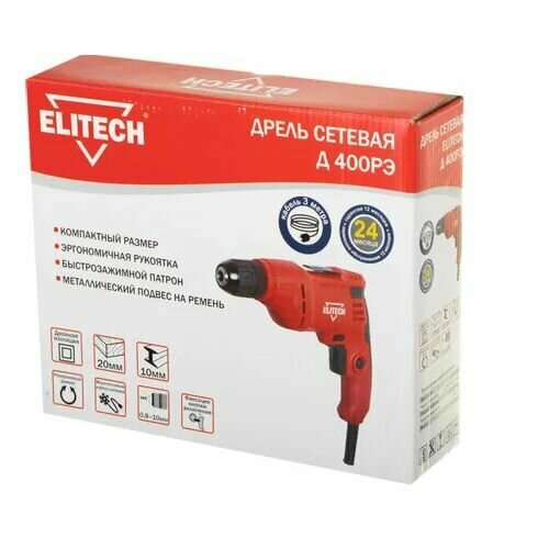 ELITECH Д 400РЭ Дрель безударная (400Вт, БЗП-10мм,0-3000об\м,1.2кг, кор, мет. клипса)