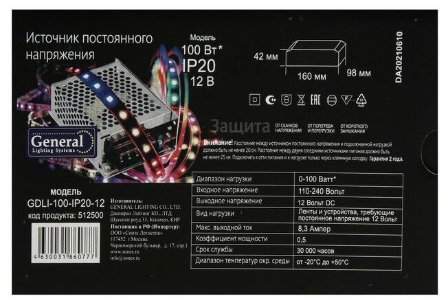 General Блок питания для светодиодной ленты напряжение 12 вольт, мощность 100 Вт, степень пылевлагозащищенности IP20