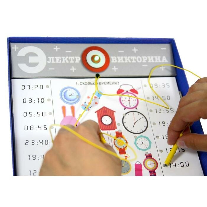 | Минусы: | Исполнение игры. Задумка хорошая, вот только многие отверстия в карточках не совпадают с нужными контактами, причем расстояние отверстия от нужного контакта может достигать 2 см. Так что если лампочка не горит, найдите нужный контакт и проделайте дырочку в карточке над ним. Кроме того набор карточек очень странный -например время на часах, притом что игра рассчитана на детей от 4 лет. Не думаю, что в 4 года ребенок знает время, а если ребенок очень развит, зачем нужна карточка с определением цвета (черный, белый и т.д.) Это для детей 2 лет. Да и дорого за такой комплект. |