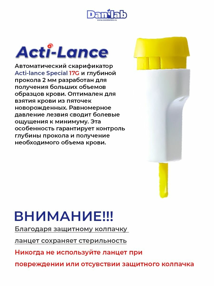 Ланцеты Acti-lance Special для капиллярного забора крови, 17G, глубина прокола 2,0 мм, желтые, 200 штук в упаковке.
