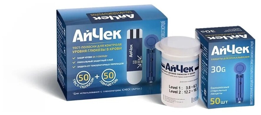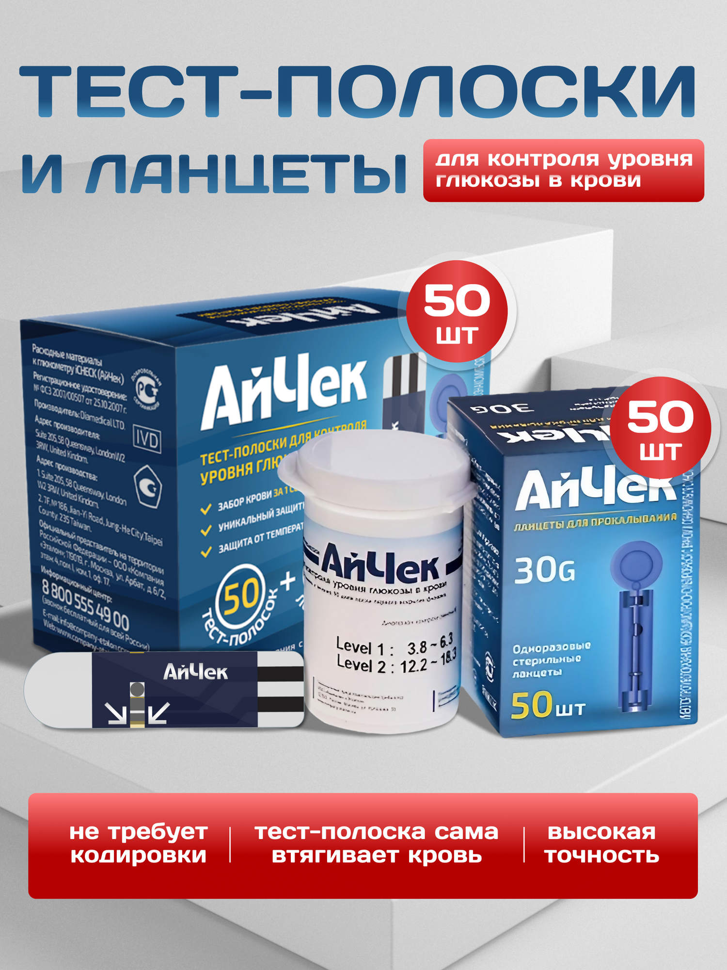 Набор iCheck/АйЧек: Тест-полоски 50шт+Ланцеты для контроля уровня глюкозы в крови 50шт