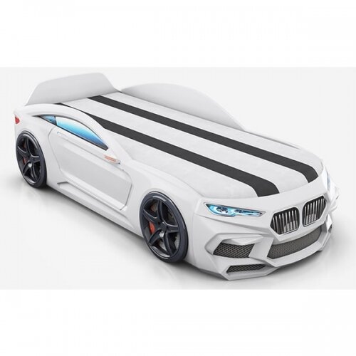 Кровать-машина "Romeo-M" белая с матрасом, подъемным механизмом, ящиком для белья и подсветкой фар в комплекте интересное: