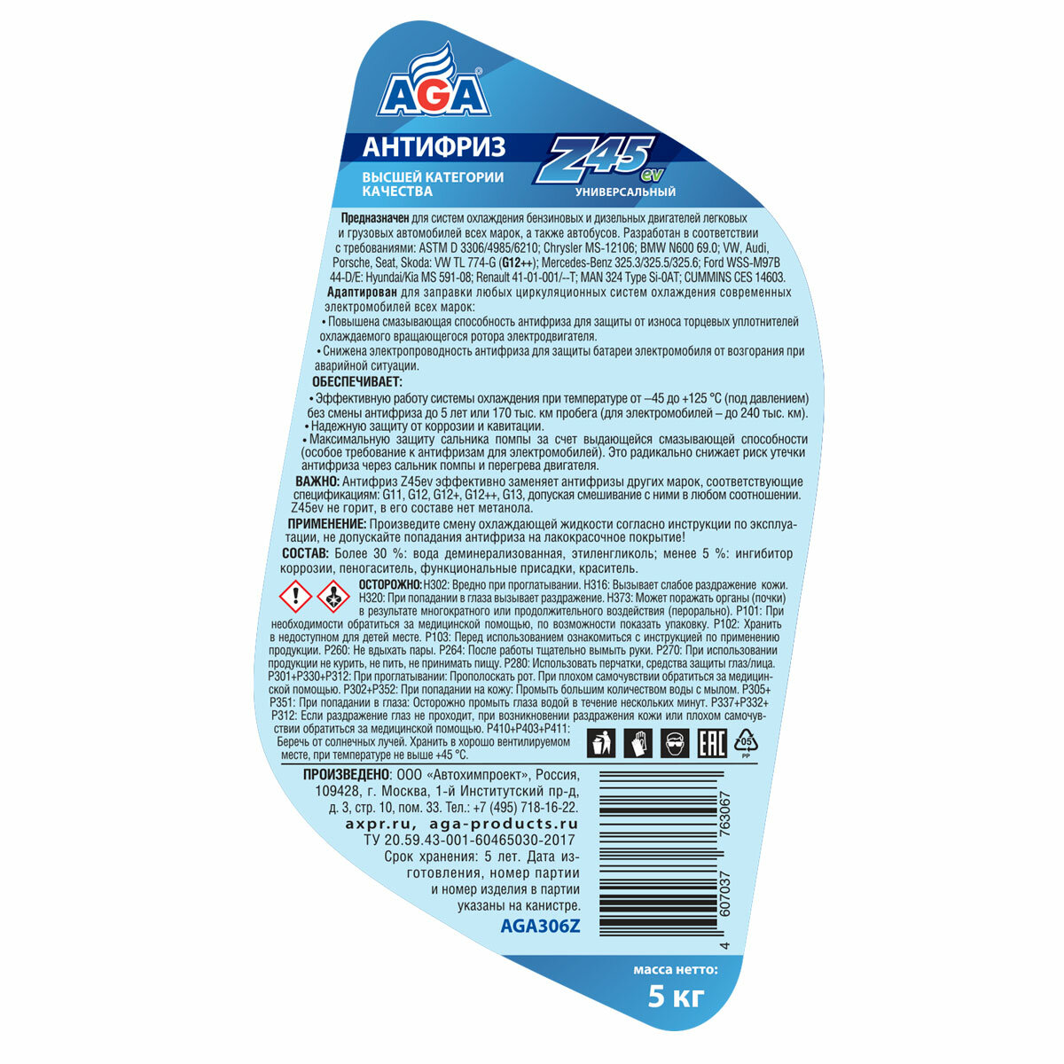 AGA306Z AGA Антифриз AGA Z45 G12++ готовый -45C синий 5 кг AGA306Z (Допуск для электромобилей)