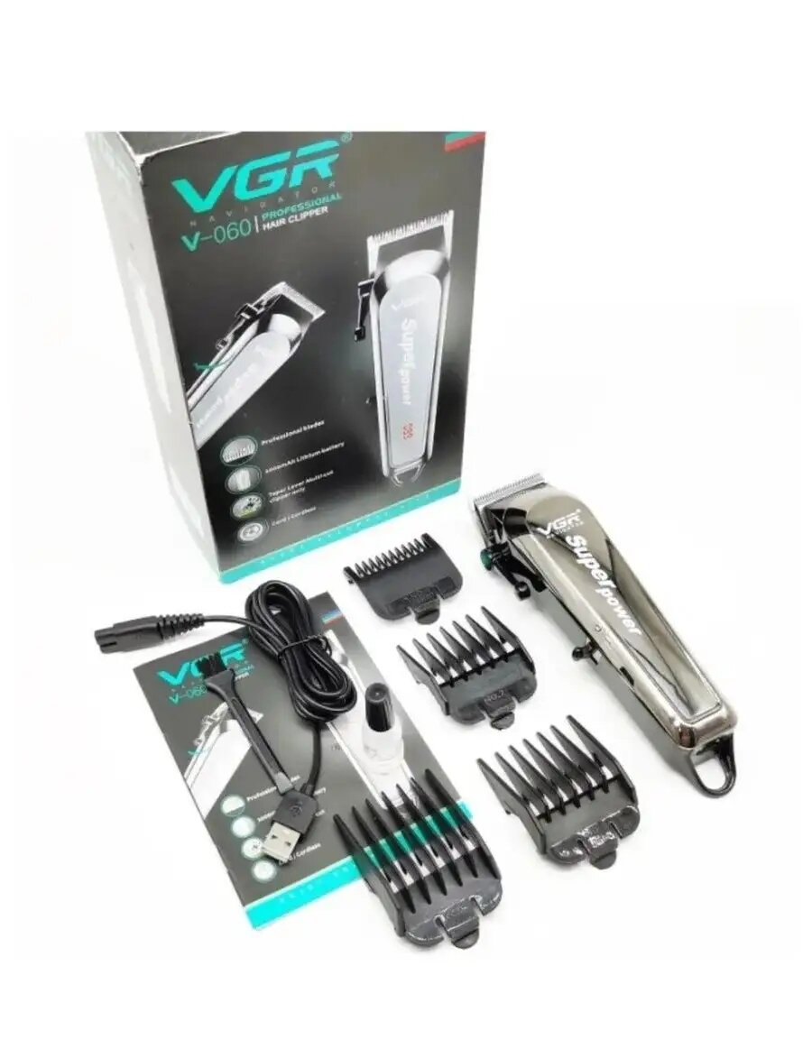 Профессиональная электрическая машинка для стрижки волос VGR NAVIGATOR PROFESSIONAL HAIR CLIPPER SUPER POWER V-060 c 4 насадками.