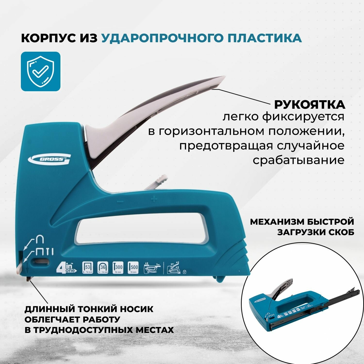 Строительный степлер Gross, тип 36, 53, 300, 500 под скобы 8 - 14 мм, пластиковый корпус