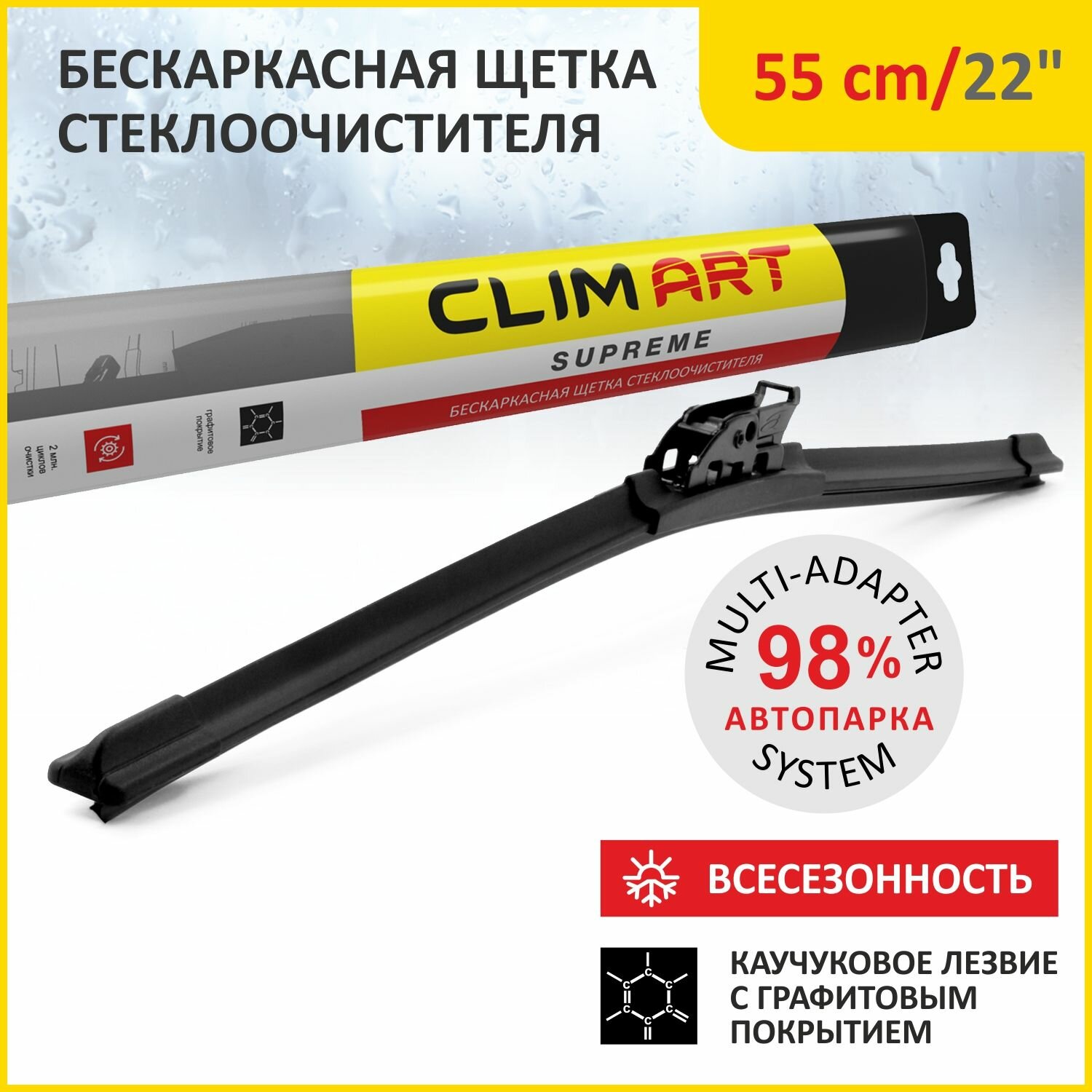 Щетка бескаркасная Clim Art Supreme 22"/55 cm, 10 адаптеров/всесезонная/дворники для автомобиля/щетки стеклоочестителя