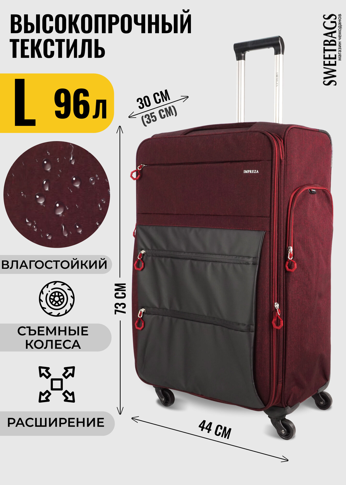 СохранитьЧемодан Sweetbags текстильный большой с 4 съемными колесами и расширением (waterproof) бордовый L интересное:
