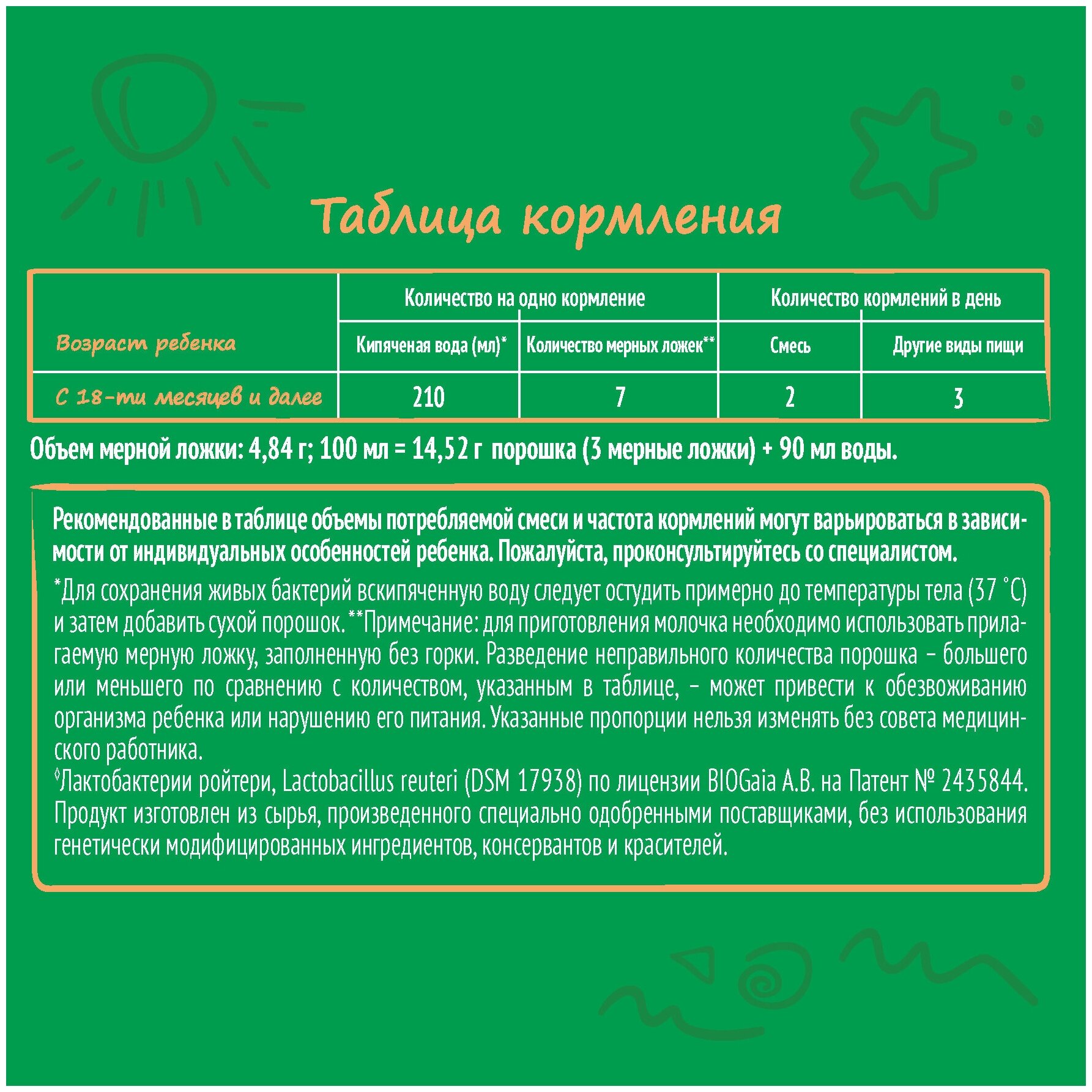 | Дополнительная информация | для сохранения живых бактерий вскипяченную воду следует остудить примерно до температуры тела (37 ̊С) и затем добавить сухой порошок. Для приготовления молочка необходимо использовать мерную ложку, заполненную без горки. Разведение неправильного количества порошка большего или меньшего по сравнению с количеством, указанным в таблице может привести к обезвоживанию организма ребенка или нарушению его питания. Указанные пропорции нельзя изменять без совета медицинского работника |