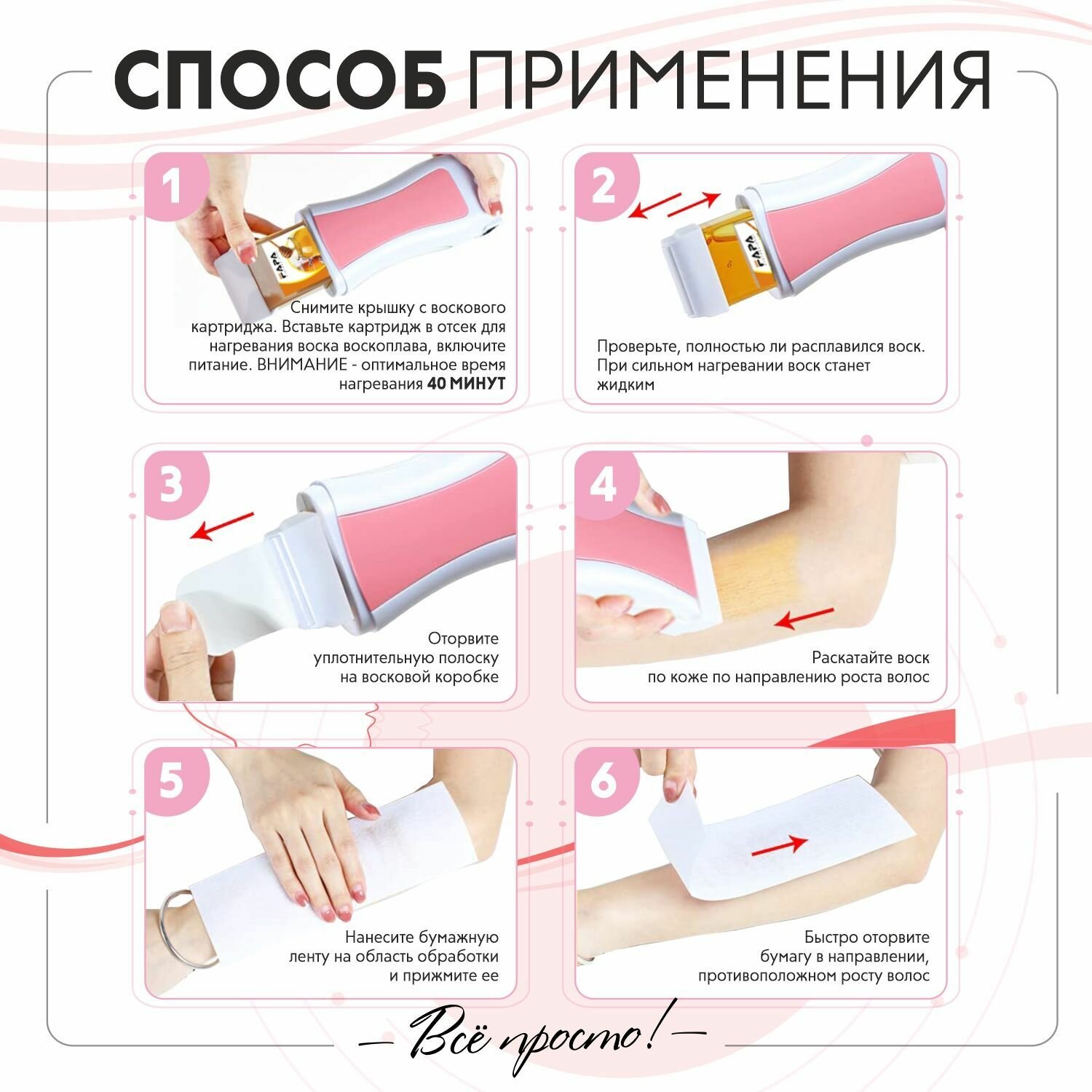 | Способ применения | 1. Перед использованием убедитесь, что кожа абсолютно чистая 2. Вставьте картриджный воск в аппарат 3. Подключите шнур к аппарату, после подключите его к розетке 4. Нагрейте воск в течении примерно 20-30 минут, затем начните использовать 5. Нанесите воск в направлении роста волос и покройте область кожи 15-18 см. Убедитесь, что температура обработки воском регулируется. Если воск слишком горячий, подождите некоторое время, чтобы начать удаление. 6. Приклейте ленту по области обработки |