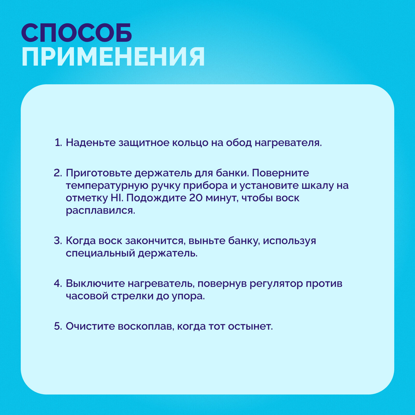| Способ применения | 1. наденьте защитное кольцо на обод нагревателя; 2. приготовьте держатель для банки, позволяющий легко обращаться с прибором; 3. поверните температурную ручку нагревателя и установите шкалу на отметку «HI» для того, чтобы воск расплавился. Эта процедура занимает около 20 минут; 4. температура будет поддерживаться в течение всего времени работы. 5. когда воск закончится, выньте банку, используя специальный держатель; 6. выключите нагреватель путем поворота регулятора против часовой стрелки до упора; 7. очищайте нагреватель в выключенном и остывшем состоянии. При новом использовании, повторите шаги 1–7. |