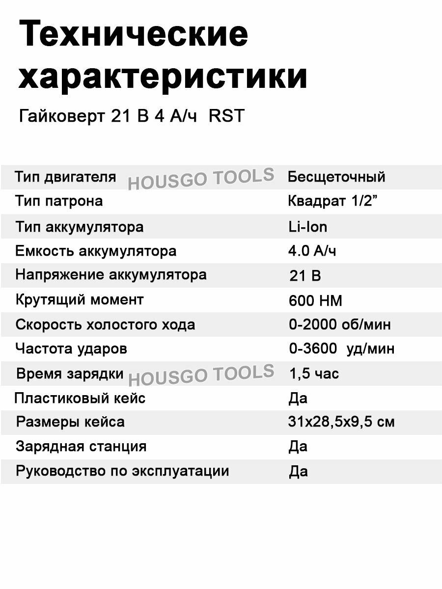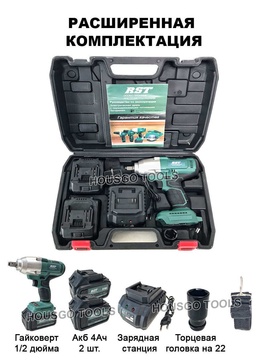 | Комплектация | - Гайковерт 1/2 дюйма; - Акб 4Ач 2 шт; - Зарядная станция; - Торцевая головка на 22; - Ремень; - Инструкция на русском языке; |