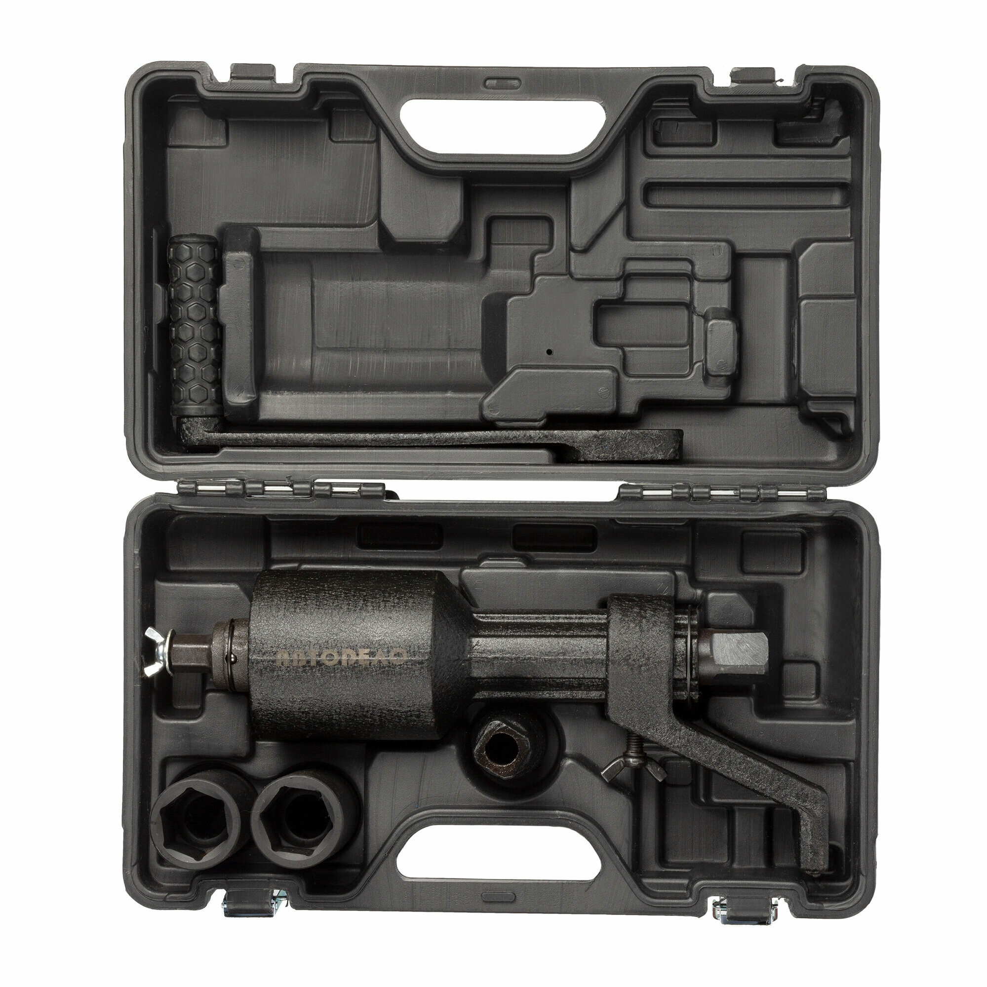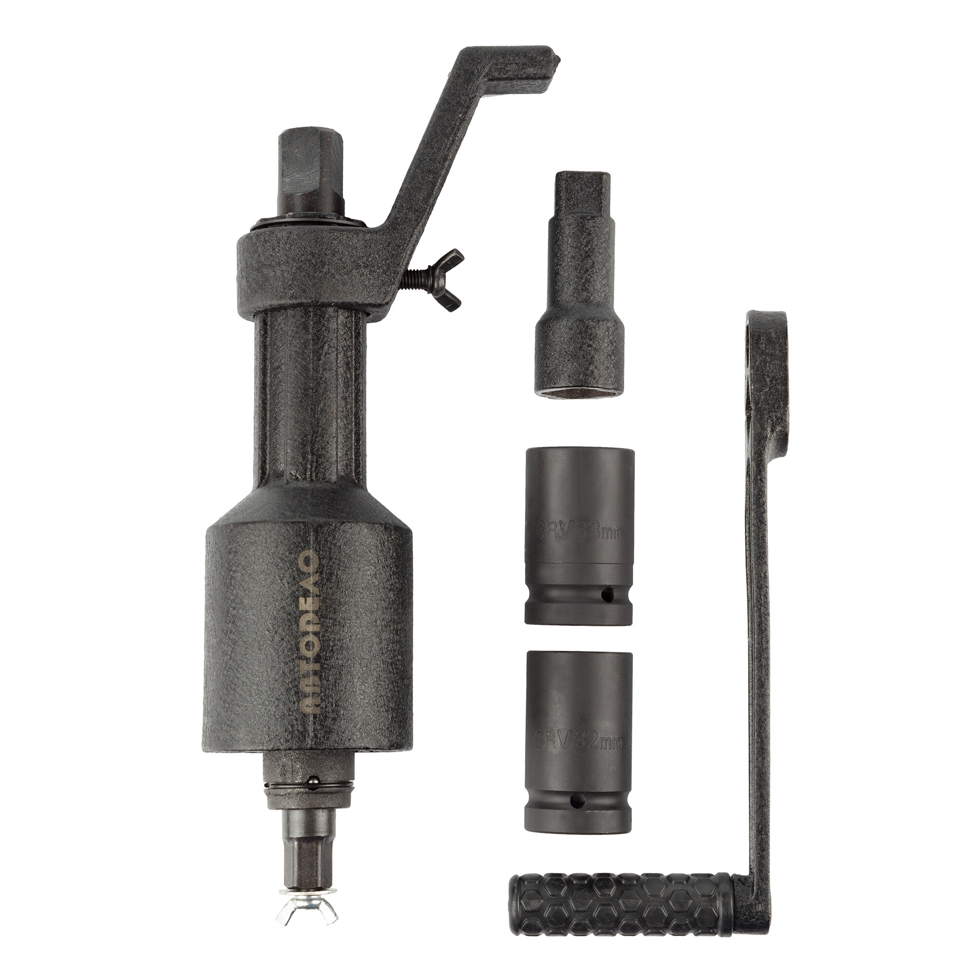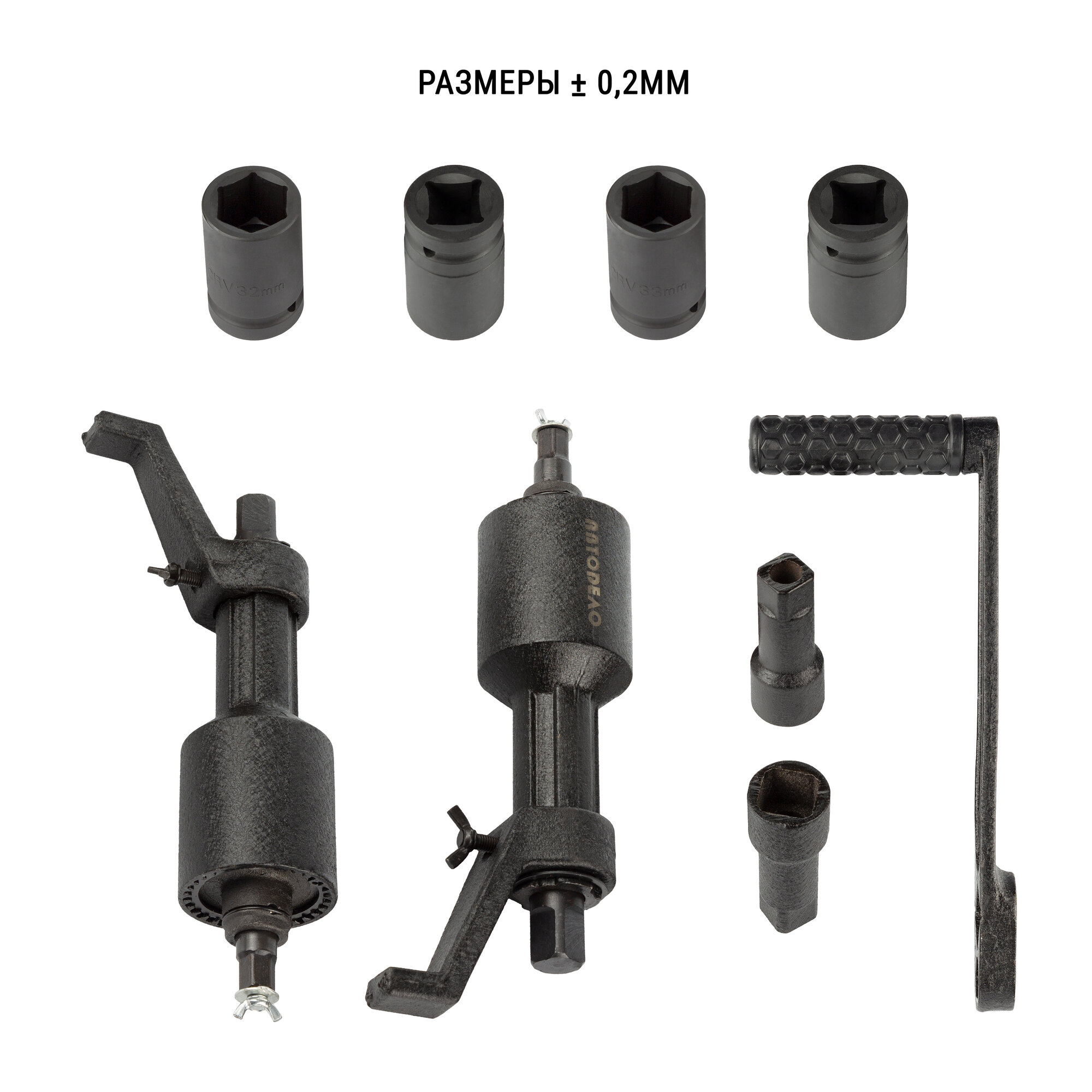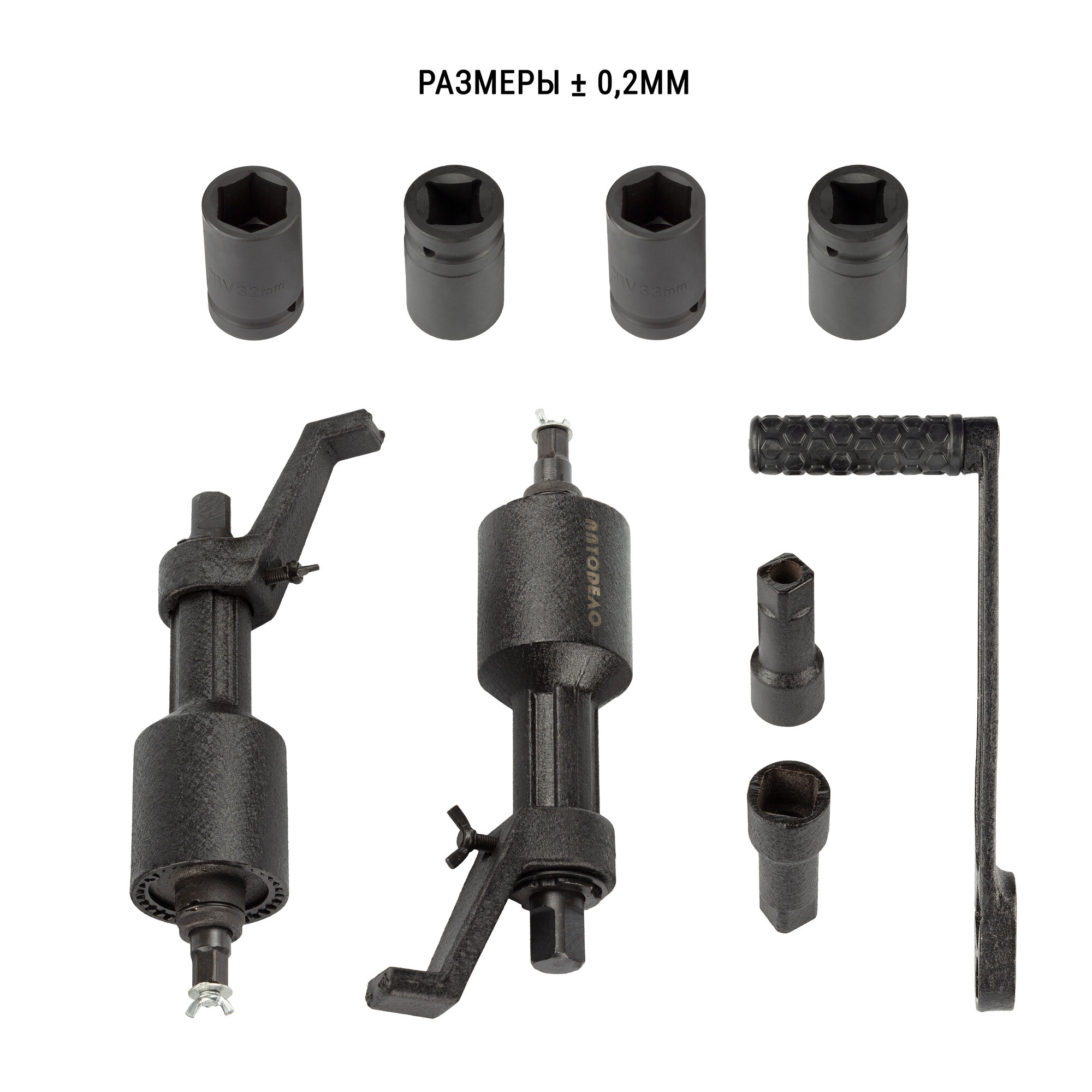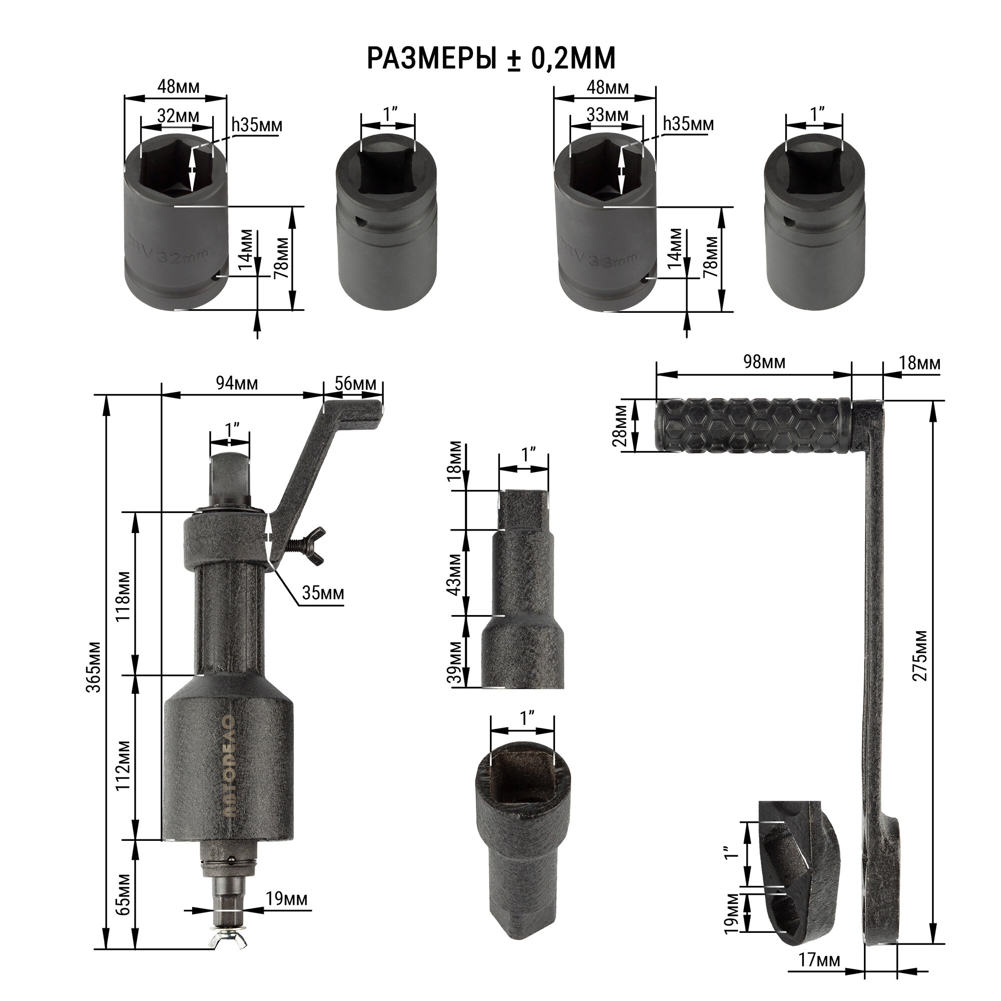 | Комплектация | Передвижная упорная лапа с фиксатором - 1 шт, съёмный рабочий вал - 1 шт, рабочая рукоятка - 1 шт, удлинитель - 1 шт, торцевые головки - 2 шт (32, 33) |