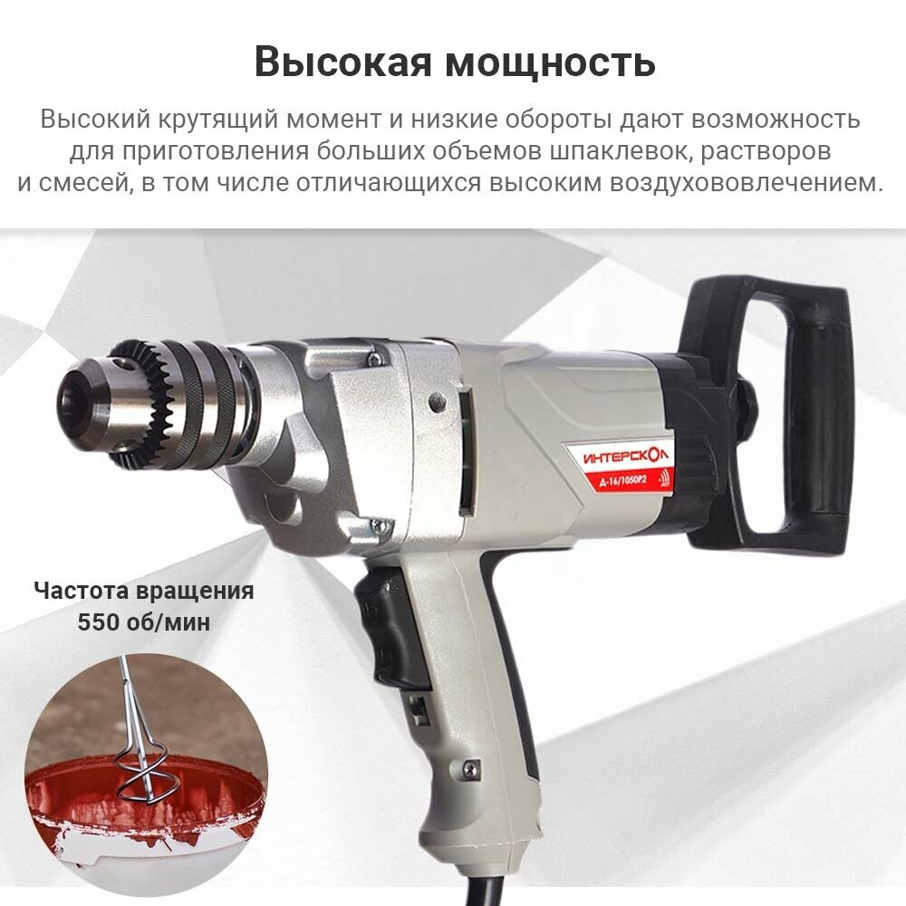 Дрель-миксер мощная низкооборотная ИНТЕРСКОЛ 473.1.0.00 Д-16/1050Р2, 1050 Вт, 160 Нм, 550 об/мин интересное: