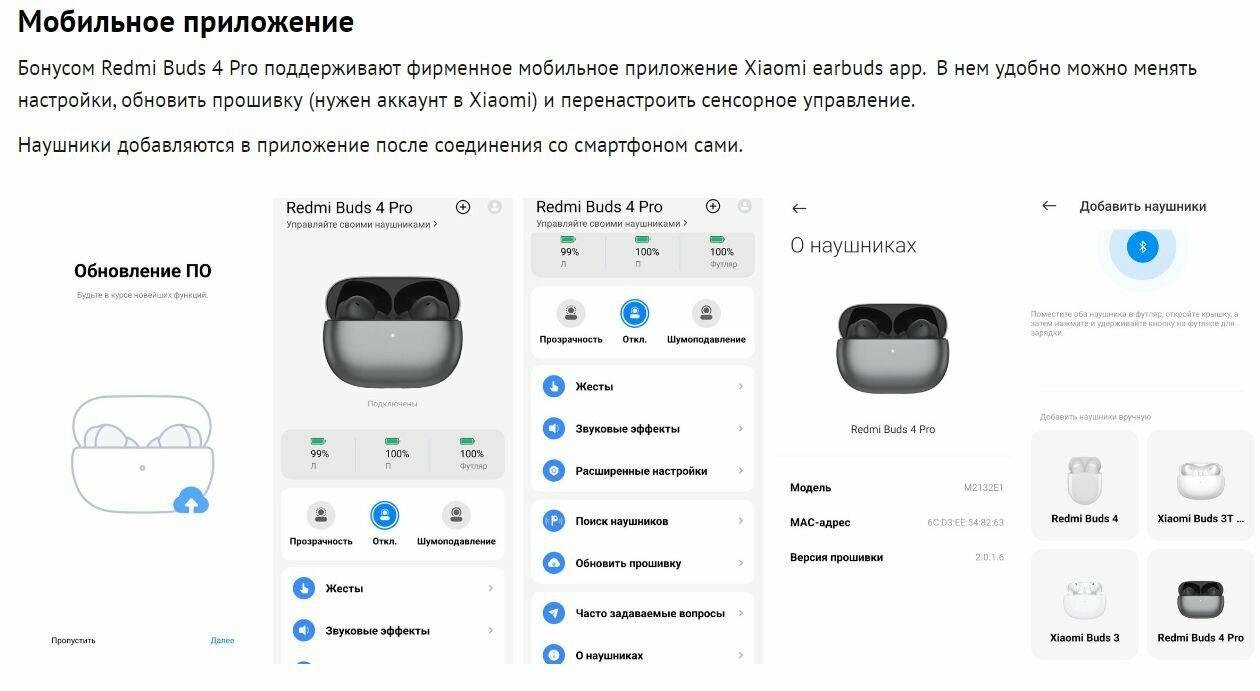 | Плюсы: | Звук у наушников очень достойный.При 40-50% громкости достаточно громкий для того, чтобы можно было гулять на улице и комфортного прослушивания любимых треков. Шумоподавление неплохое, ветра не боится – можно смело гонять на велике. На качество звука через микрофон при звонке шумодав особо не влияет. Микрофон отличное передает голос. Для разговоров по телефону на мой взгляд идеально.Посадка и удобство ношения просто на высоте. Не выпадают, дискомфорта при ношении не доставляют. В ушах сидят очень удобно не зависимо от того что ты делаешь. Кейс небольшой и очень удобно ложится в карман. Для соединения с телефоном использовал приложение Xiaomi Earbuds. Управлении жестами можно сразу же настроить как удобно в этом самом приложении. Тапы работают нормально, чувствительность как раз такая, что бы и переключалось всё без проблем, и случайные прикосновения не мешали. Достал из уха/вставил обратно - музыка ставится на паузу/продолжается воспроизведение, с этим проблем нет. По времени работы нареканий нет – свои 5-6 часов при активном шумоподавлении отрабатывают честно, всего 70% ушло за 5.5 часов постоянного прослушивания музыки (кодек ААС). Если использовать без шумодава, пишут про 9 часов, но не было случая так долго слушать. Быстрая зарядка имеется: за час полностью с 0 до 100 от ноутбука.Багов с рассинхроном или какой-то задержкой также нет.Шумодав хороший есть несколько режимов: слабо - сбалансировано - сильно, есть так же функция адаптивное шумоподавление.