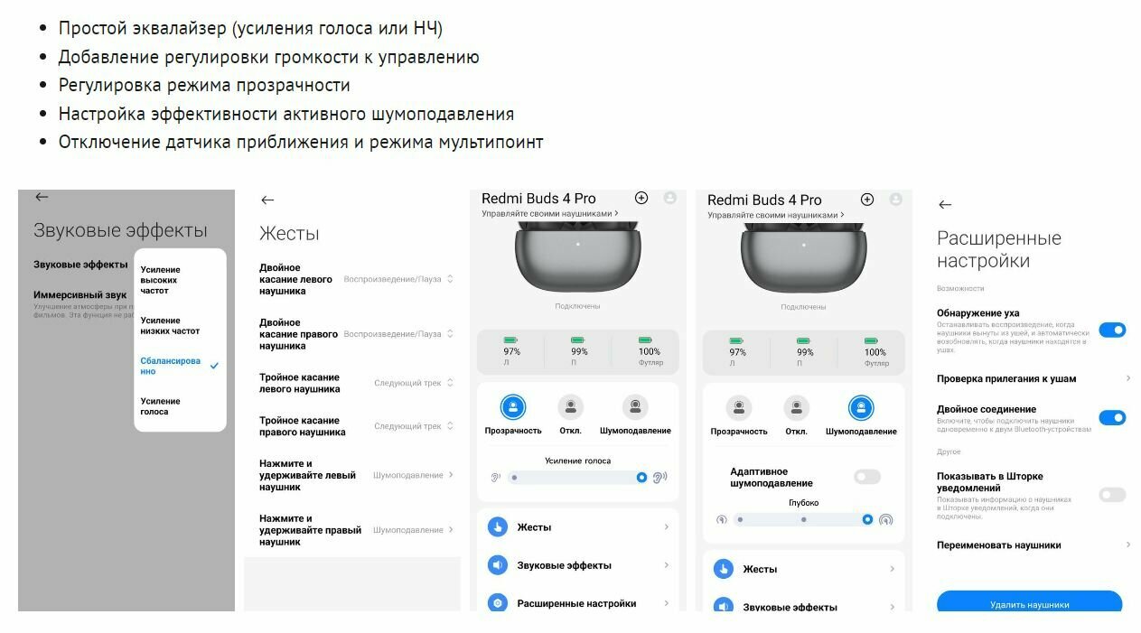 | Функции | Multipoint / Talk through (режим прозрачности) / объемный звук / поиск наушников |