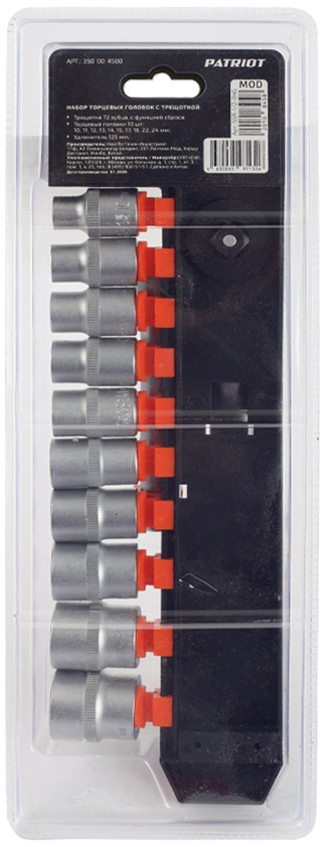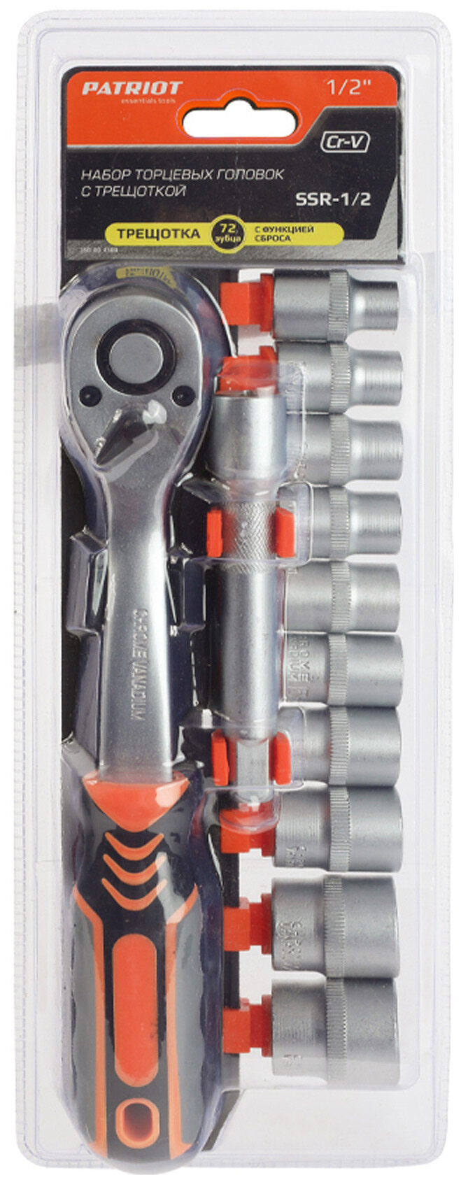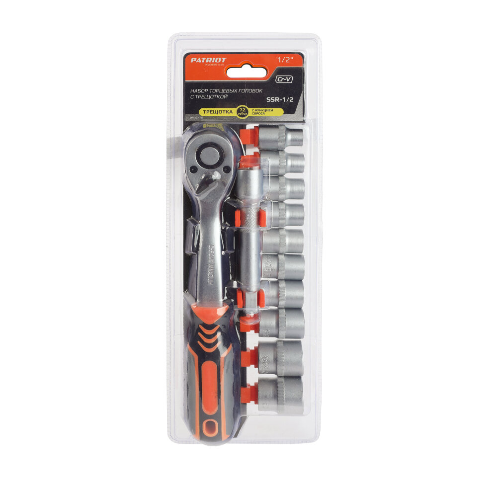 Набор торцовых головок PATRIOT SSR-1/2, CrV сталь, трещотка, удлинитель, 12 предм.Тороцовые головки 10 шт: 10,11,12,13,14,15,17,19,22,24мм удлинитель 125мм 1шт трещотка 72 зуба 1 шт