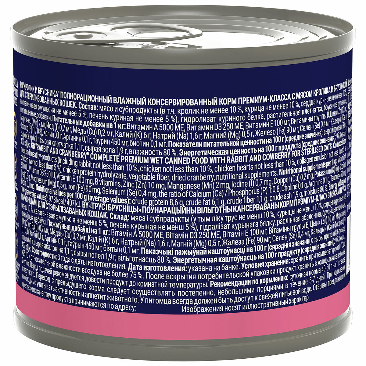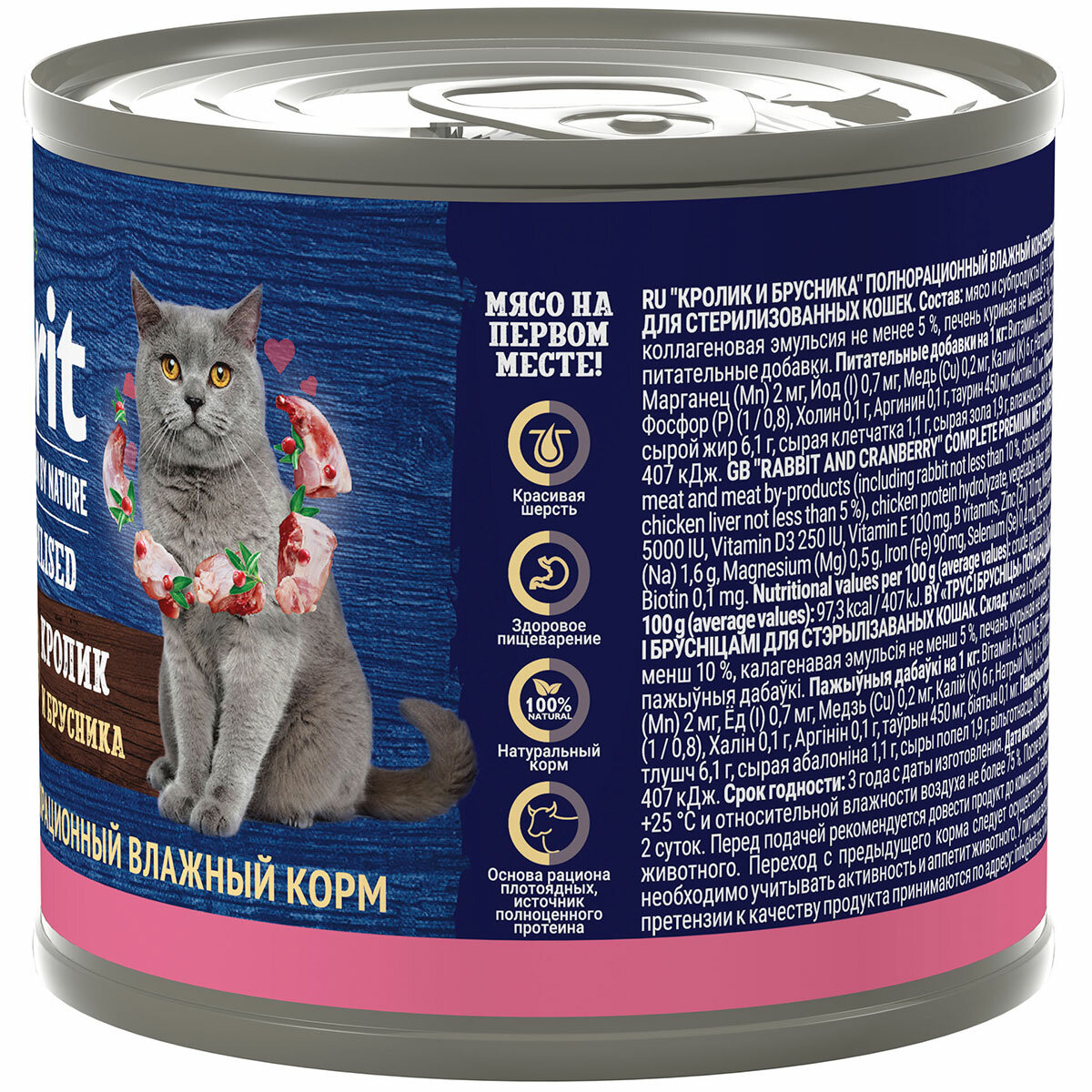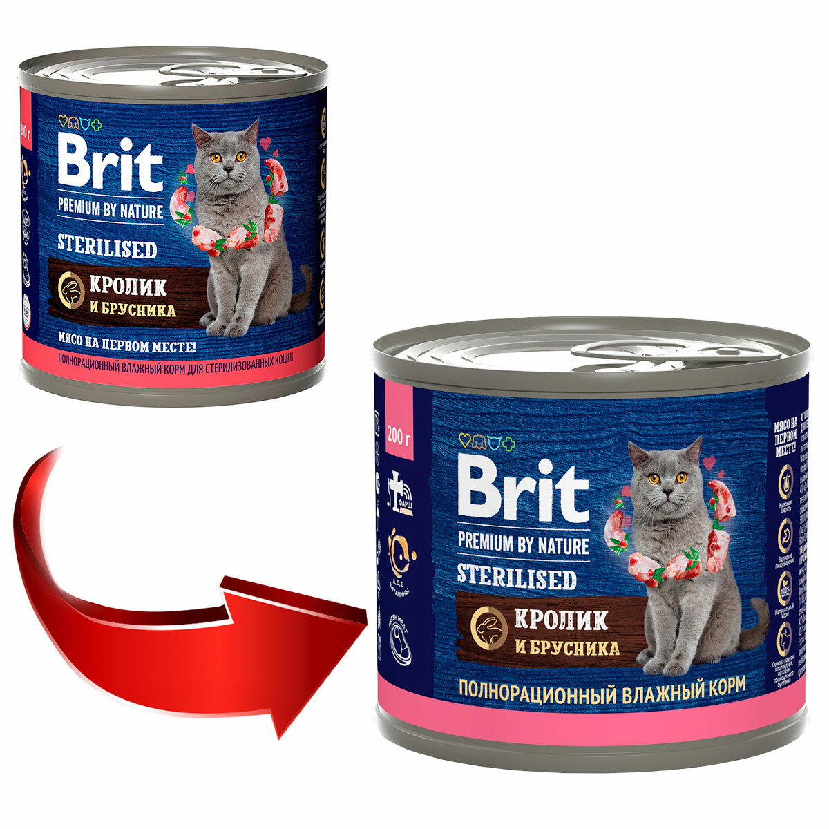 Корм для кошек BRIT Premium by Nature для стерилизованных, мясо кролика с брусникой банка 200г