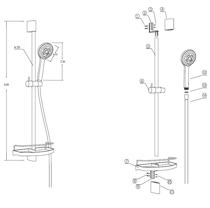 | Дополнительная информация | высота стойки для душа: 650 мм; диаметр душевой лейки: 97 мм |