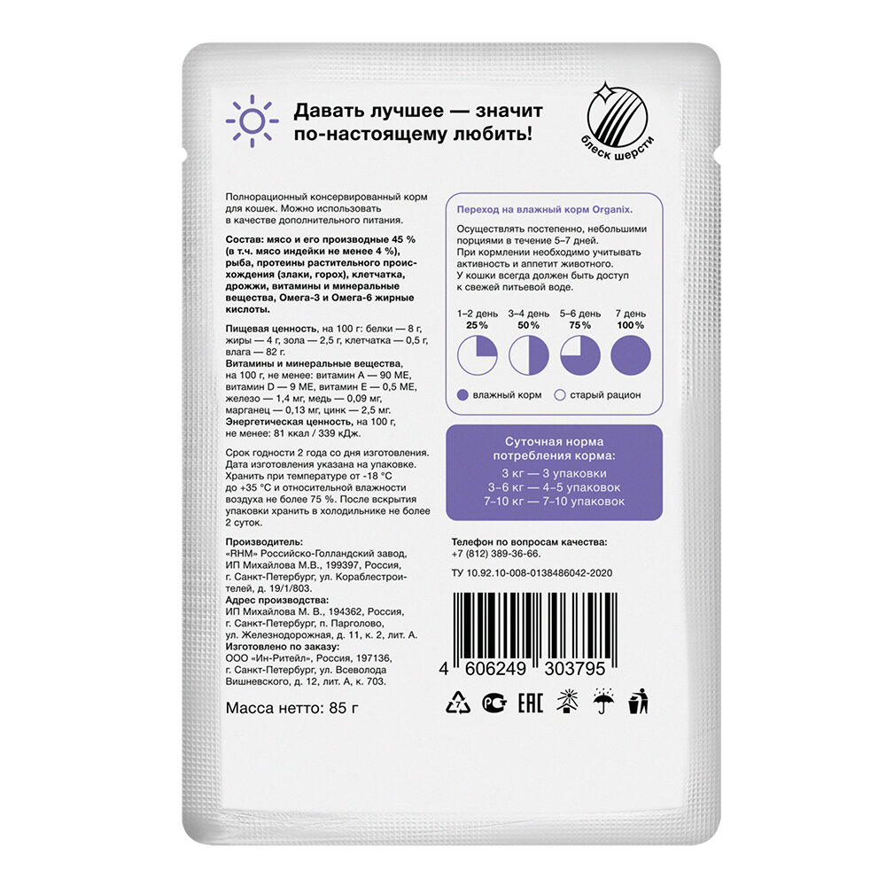 ORGANIX корм влажный "Индейка в соусе" в паучах для стерилизованных кошек и кастрированных котов, 85 гр х 25 шт. интересное: