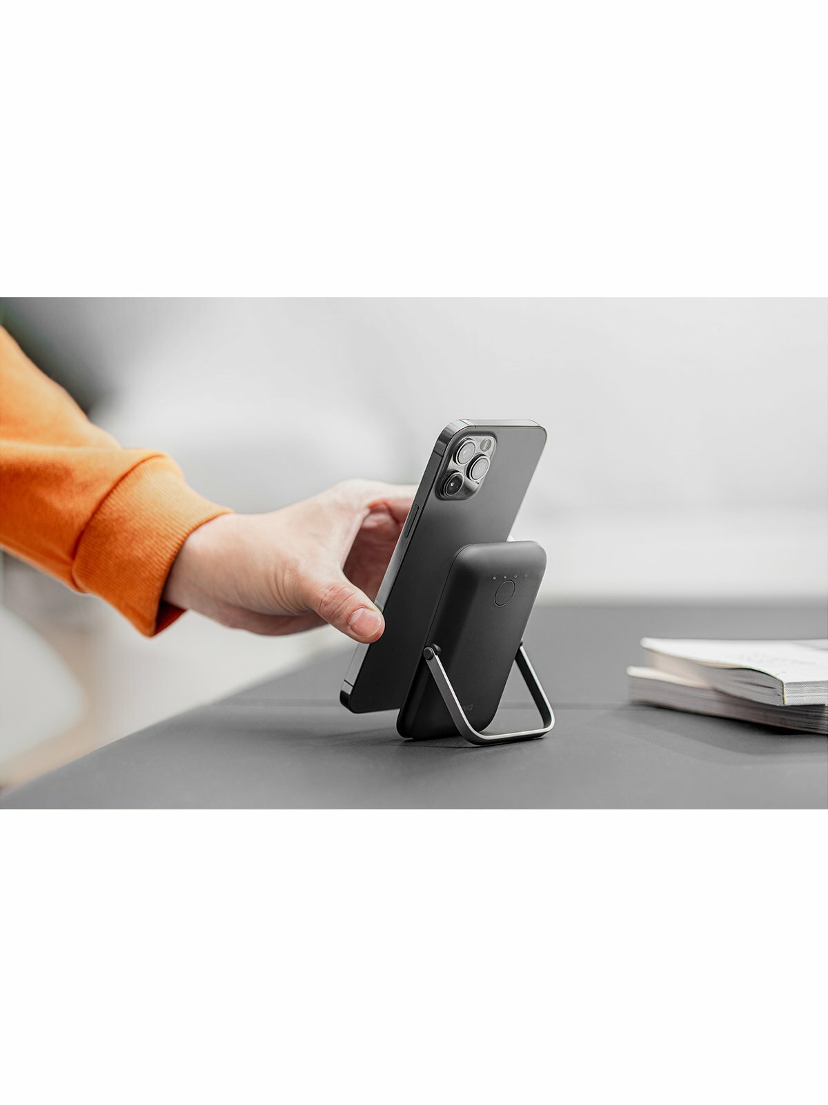 | Плюсы: | Хорошо примагничевается, может заряжать через usb c, есть подставка, компактный. |