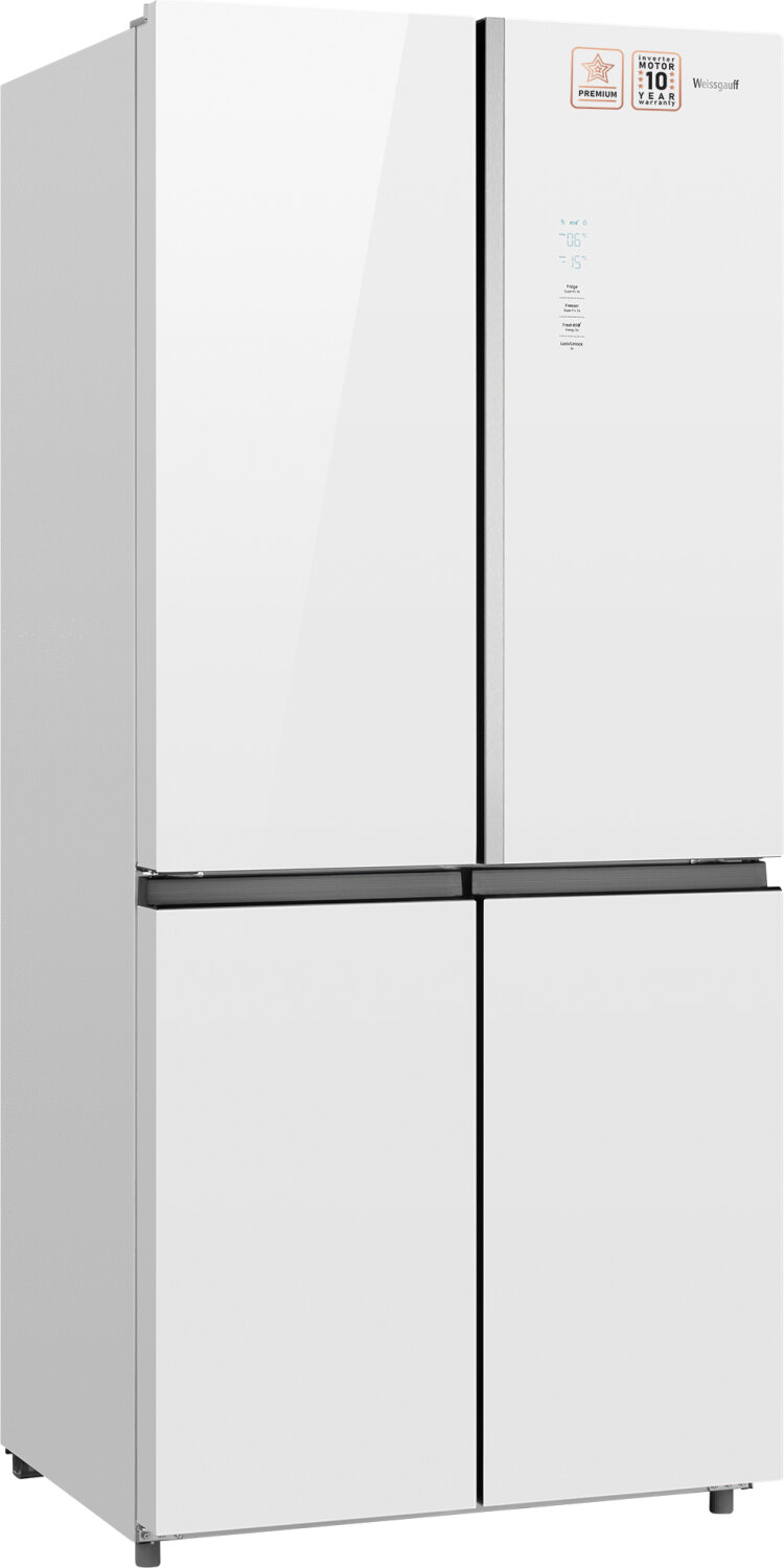 Отдельностоящий холодильник с инвертором Weissgauff WCD 590 Nofrost Inverter Premium EcoFresh White Glass, CrossDoor, технологии Multi Air Flow, Metal-Tech Cooling, суперохлаждение, суперзаморозка