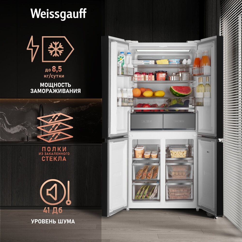 Отдельностоящий холодильник с инвертором Weissgauff WCD 590 Nofrost Inverter Premium Ecofresh Black Glass 3 года гарантии, CrossDoor, технология Multi Air Flow и Metal-Tech Cooling, суперзаморозка, суперохлаждение, LED-освещение