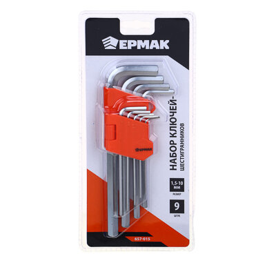 Набор ключей - шестигранников ермак 1,5-10мм, с шаром удл.,9шт. (015) 657-015