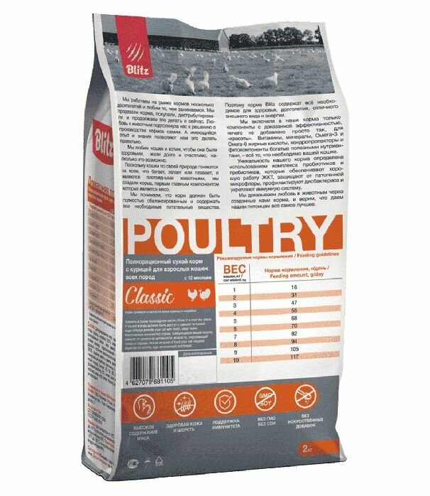 Сухой корм для взрослых кошек Blitz 2кг Adult Classic Poultry Домашняя птица/Блиц Сухой корм для кошек Полтри интересное: