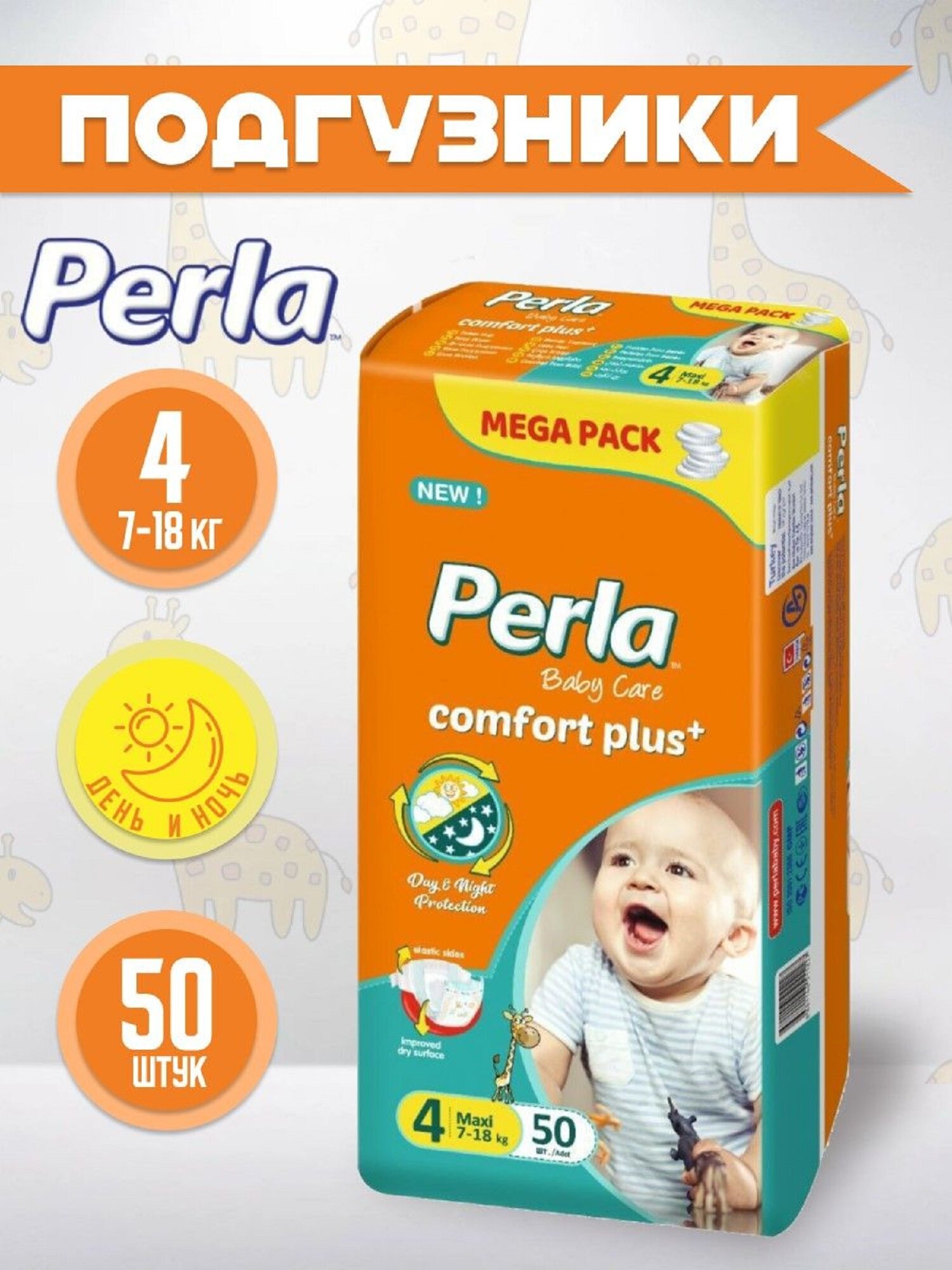Памперсы детские Perla Mega Maxi 7-18 кг, 4 размер, 50 шт, подгузники для детей мегаупаковка, для мальчиков и девочек, Турция