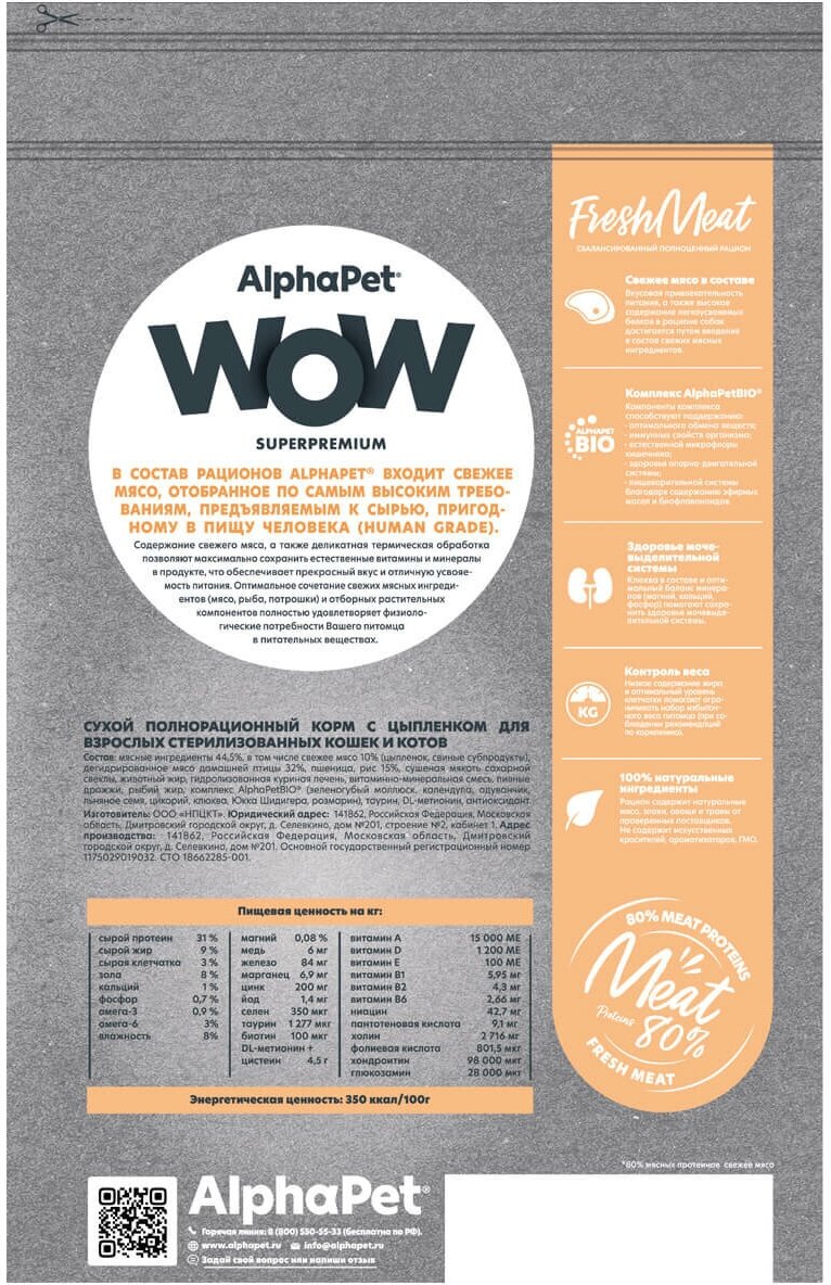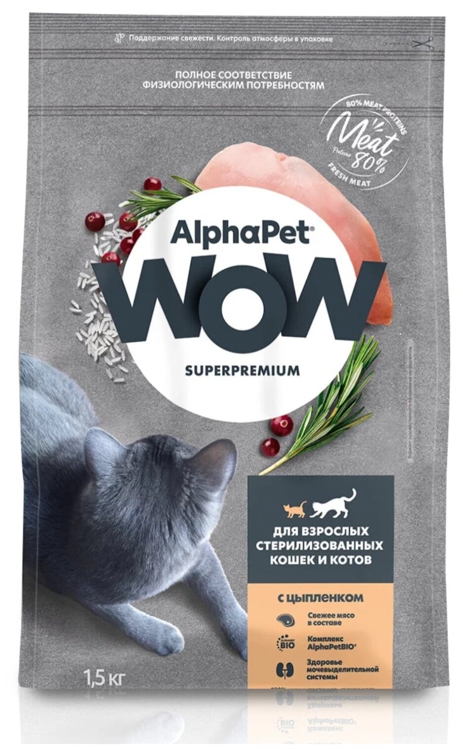 ALPHAPET WOW SUPERPREMIUM 1,5 кг, сухой корм для взрослых стерилизованных кошек и котов c цыпленком, ALPHAPET WOW