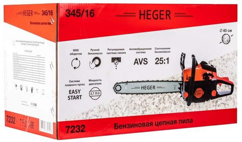 | Дополнительная информация | Благодаря высоким требованиям к производству, бензопилы HEGER обладают рядом технических преимуществ и не уступают аналогичным пилам в том же классе. Система облегченного запуска на 60% уменьшает прилагаемое при запуске усилие; Антивибрационная система снижающая дискомфорт при длительной работе; Автоматическая система подачи смазки на цепь (с возможностью регулировки); Дополнительная безопасность оператора обеспечивается уловителем цепи; Ручной насос "праймер" позволяет обеспечить быстрый и легкий запуск; Фильтр многоразового использования продлит срок службы вашей бензопилы; Цельнолитая ведущая звезда привода цепи увеличивает срок службы пилы; Хромированная поршневая система обеспечивает увеличение ресурса двигателя в 2 раза. |