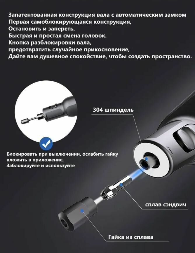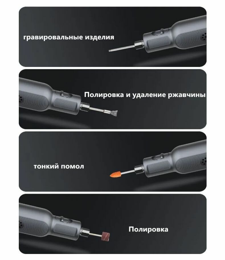 | Комплектация | 1. Мини шлифовальный станок со встроенным аккумулятором - 1шт. 2. Пластиковый кейс для инструмента и насадок - 1шт. 3. Аксессуары - 52шт. 4. Провод для зарядки USB Type-C - 1шт. |