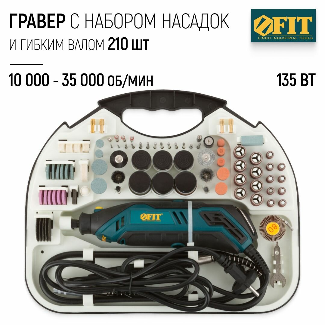 Купить Гравировальная машина 130 Вт; 10000-35000 об/мин; 2,4/3,2 мм; БС щеток; набор насадок 210 шт.; кейс Fit