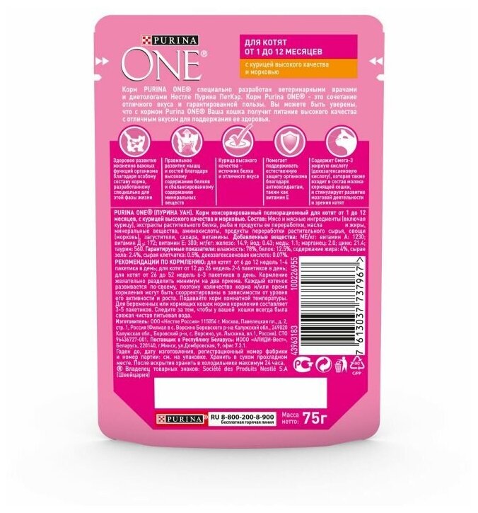 Влажный корм Purina One для котят, курица с морковью, пауч, 75 г*26 шт