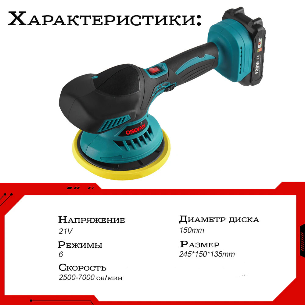 | Комплектация | полировальная машина; 4 диска; 2 аккумулятора; фартук; перчатки |