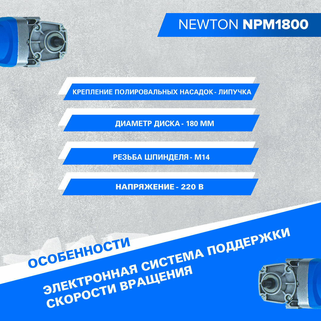 Полировальная машина Newton NPM1800 (1800Вт, 180мм, 3000 об/мин, липучка, шпиндель М14, посад. диам. 22.2) интересное: