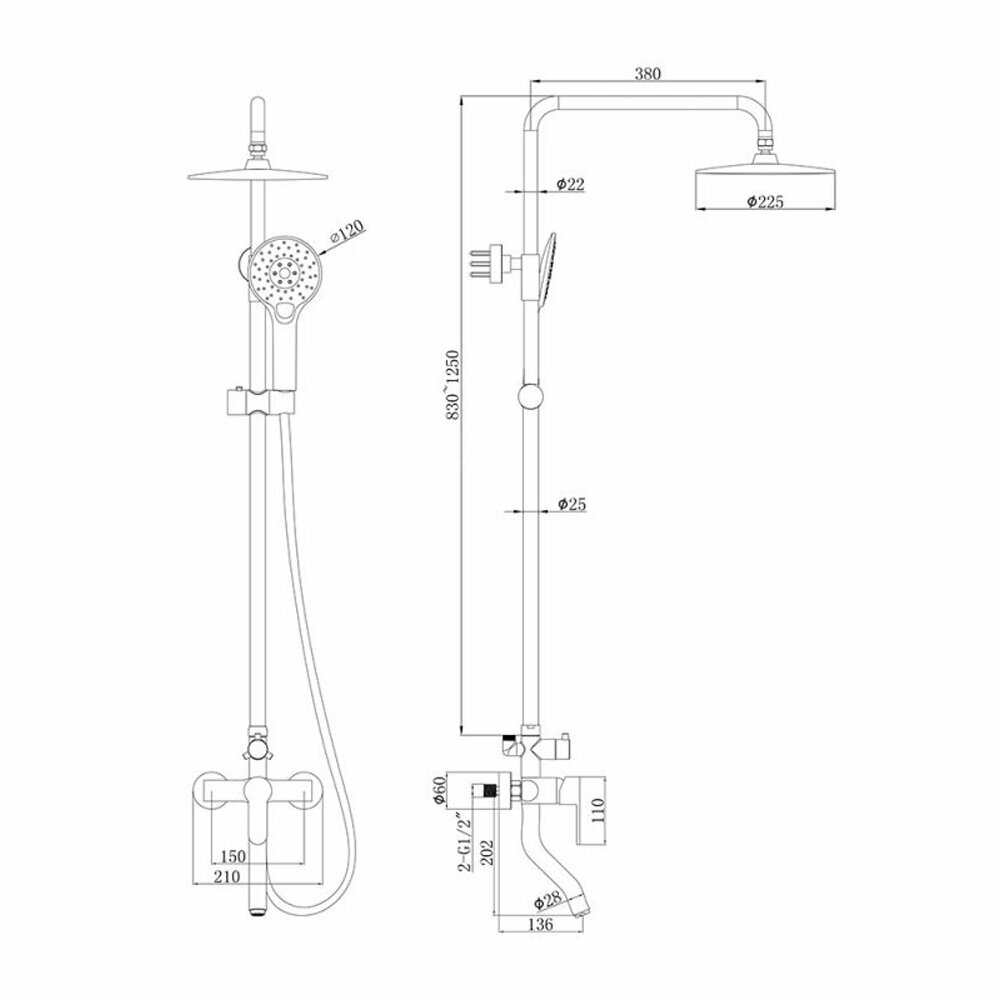 | Дополнительная информация | высота стойки для душа: 1250 мм; диаметр душевой лейки: 120 мм; диаметр верхнего душа: 225 мм |