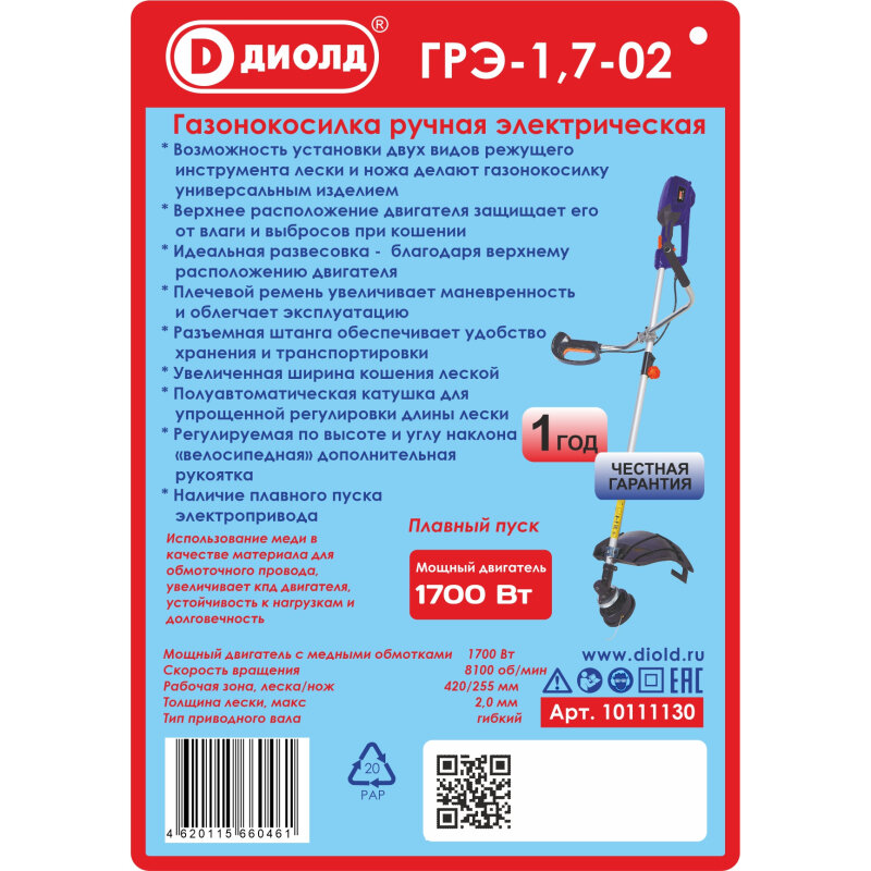 Триммер электрический диолд ГРЭ-1,7-02 10111130 1700Вт, разборная штанга