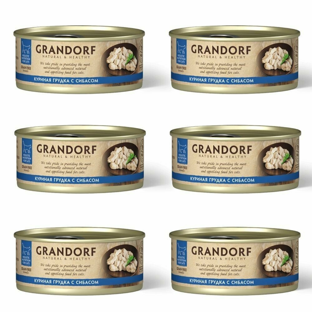 GRANDORF влажный корм для кошек, куриная грудка с сибасом, упак. 6 банок по 70 гр