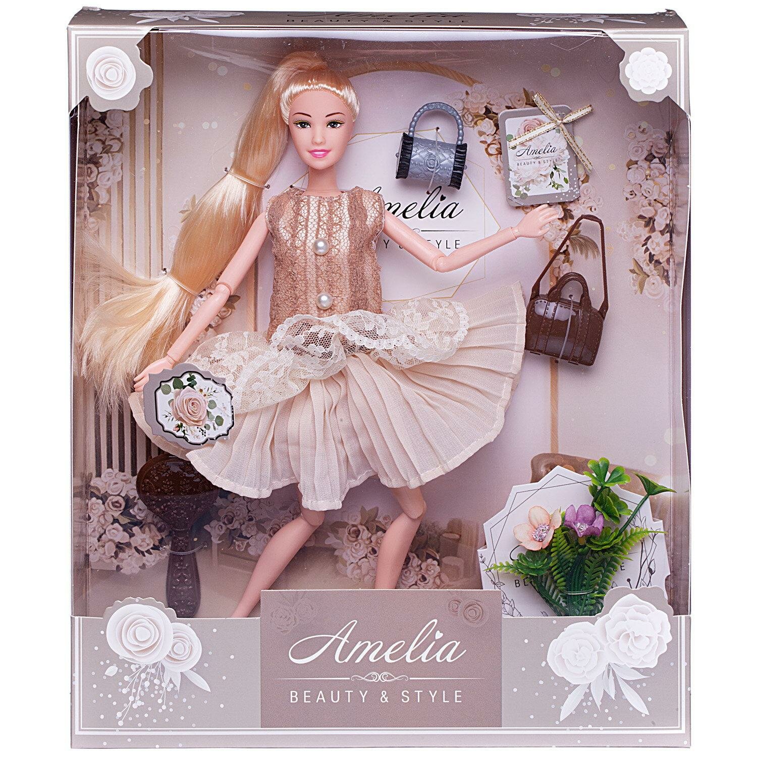 Кукла ABtoys "Amelia. Современный шик" в платье без рукавов с плиссированной юбкой, коричневая сумка