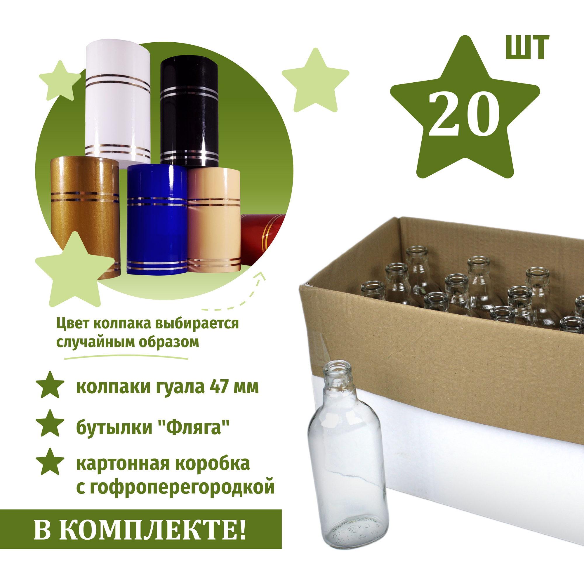 Бутылка из прозрачного стекла "Фляга" 0,5 л., 20 шт. пробки в комплекте интересное: