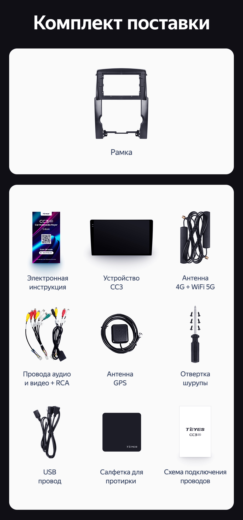 | Дополнительная информация | Головное устройство, Рамка для установки в штатное место, Комплект необходимых проводов, Схема подключения проводов, Антенна GPS+Антенна 4G+Антенна 5G , 3 USB провода, Шурупы и отвертка, Салфетка из микрофибры, Электронная инструкция |