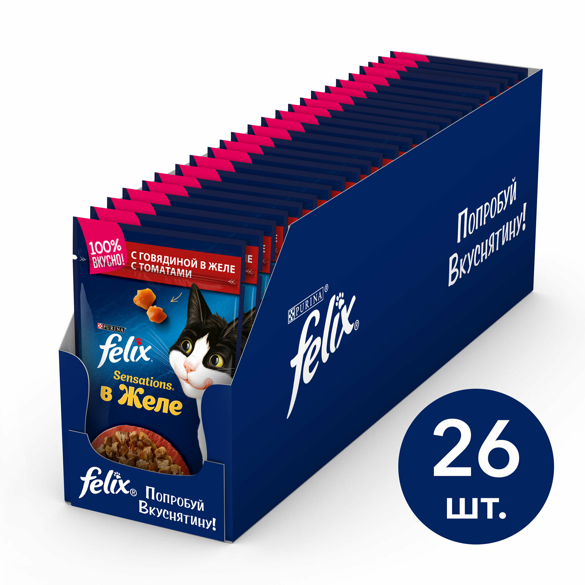 Felix Sensations 75 г пауч влажный корм для кошек, с говядиной в желе с томатами х26 штук
