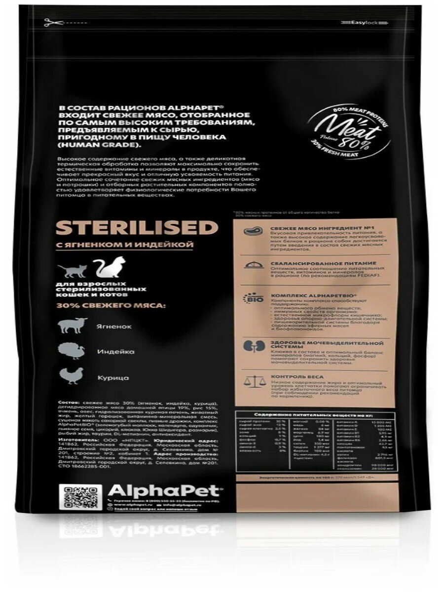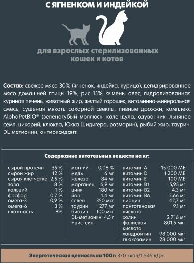 Сухой корм AlphaPet Superpremium для стерилизованных кошек, полнорационный с ягненком и индейкой1.5к