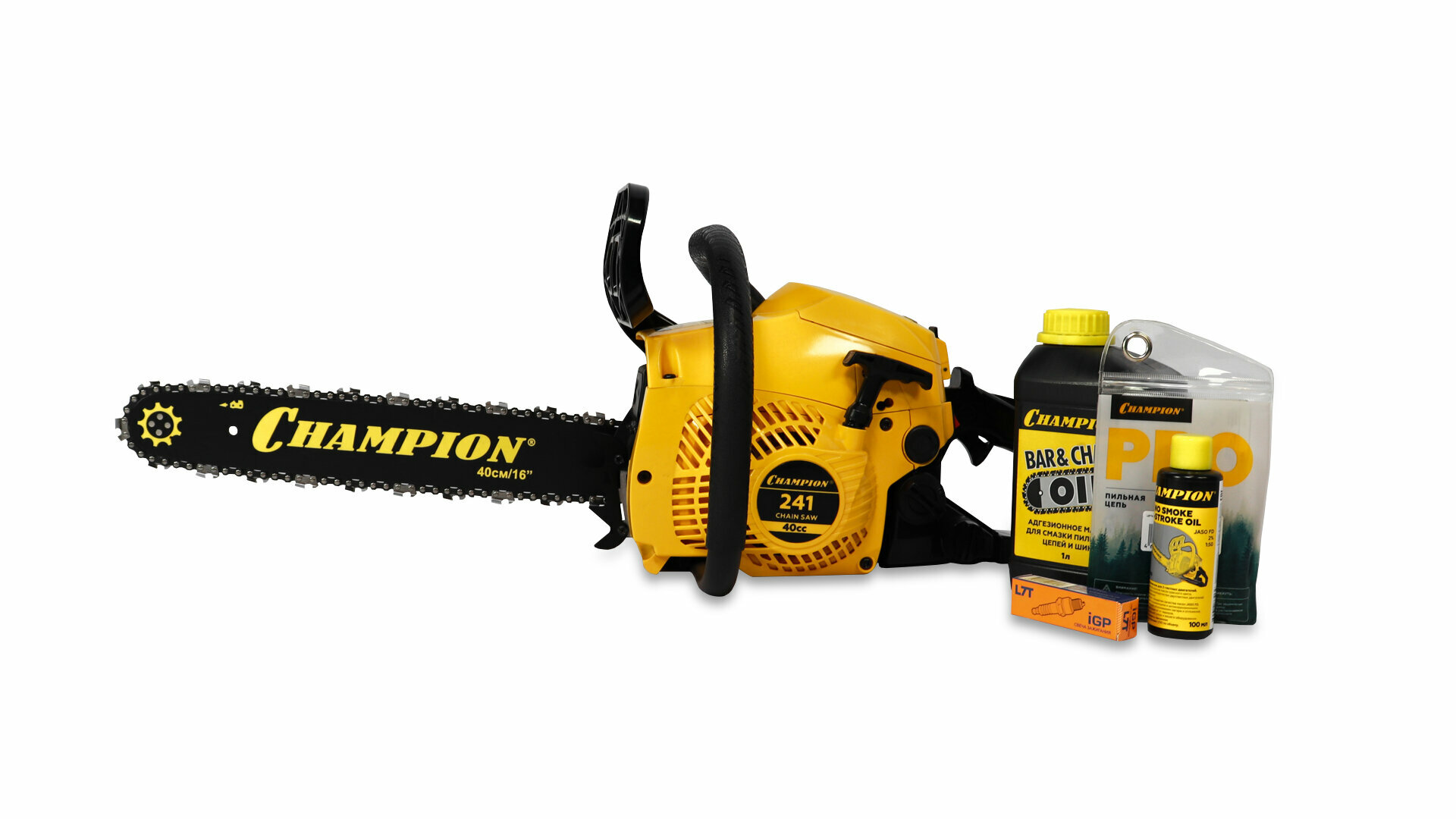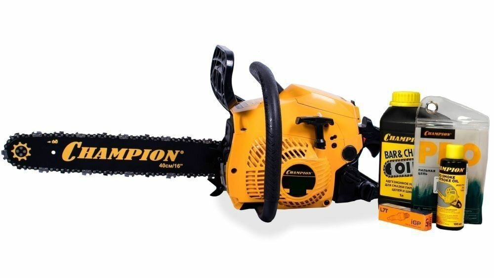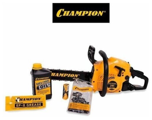 Бензопила цепная бензиновая CHAMPION 241-16 + масло для цепи, свеча, смазка и цепь