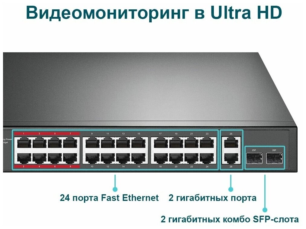 | Дополнительная информация | 2 порта RJ45 10/100/1000 Мбит/с; 24 порта PoE+ 10/100 Мбит/с, Plug and Play, дальность PoE для видеонаблюдения - до 250 м; возможность назначения высокого приоритета портам 1-8; режим изоляции для разделения трафика портов 1-24; 2 вентилятора |