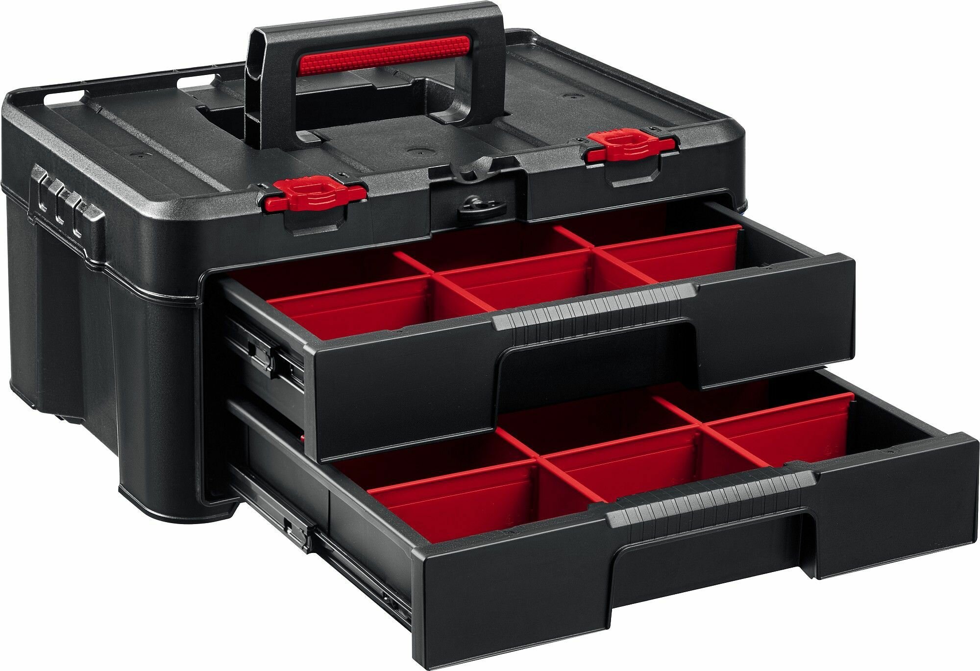 | Дополнительная информация | усиленные стенки, длинное отделение для ручного инструмента, прочная прозрачная крышка позволяет увидеть наполнение органайзера, профессиональный органайзер: 12 съемных лотков 2х размеров, металлические замки обеспечивают надежную фиксацию |