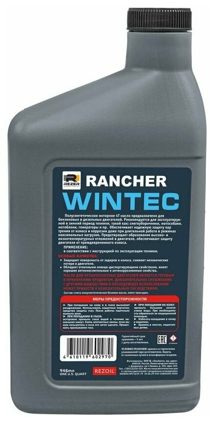 Полусинтетическое моторное четырехтактное масло Rezer Rancher WINTEC 4T 0,946 л для снегоуборочников, мотоблоков, генераторов 03.008.00049