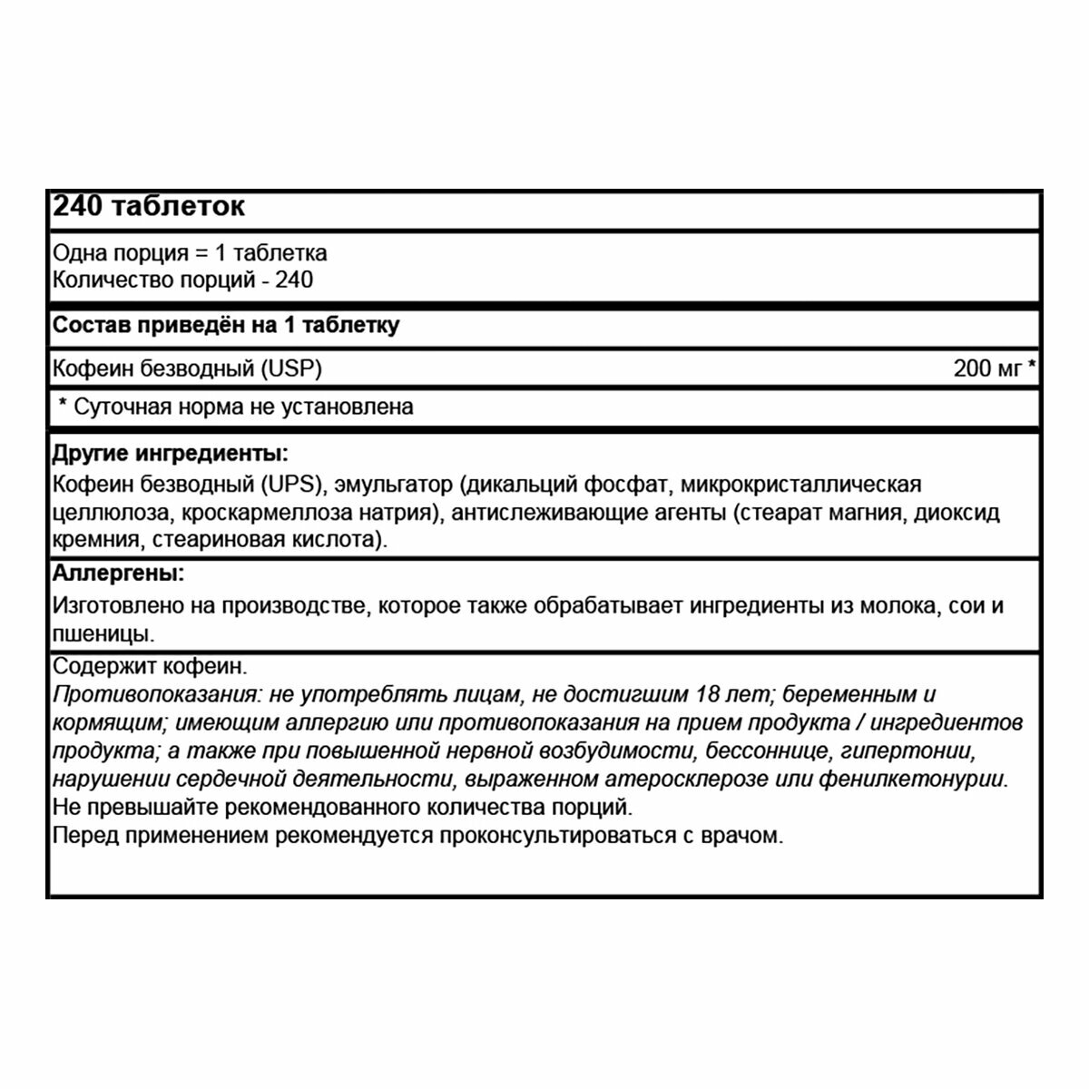 | Дополнительная информация | никогда не принимайте больше 2 порций в сутки, пейте от 8 до 10 стаканов воды в день; рекомендации по применению: принимать по 1 таблетке в день, запивая стаканом воды; чтобы оценить индивидуальную переносимость, примите 1/2 таблетки, запив стаканом воды; состав: кофеин безводный 200 мг |