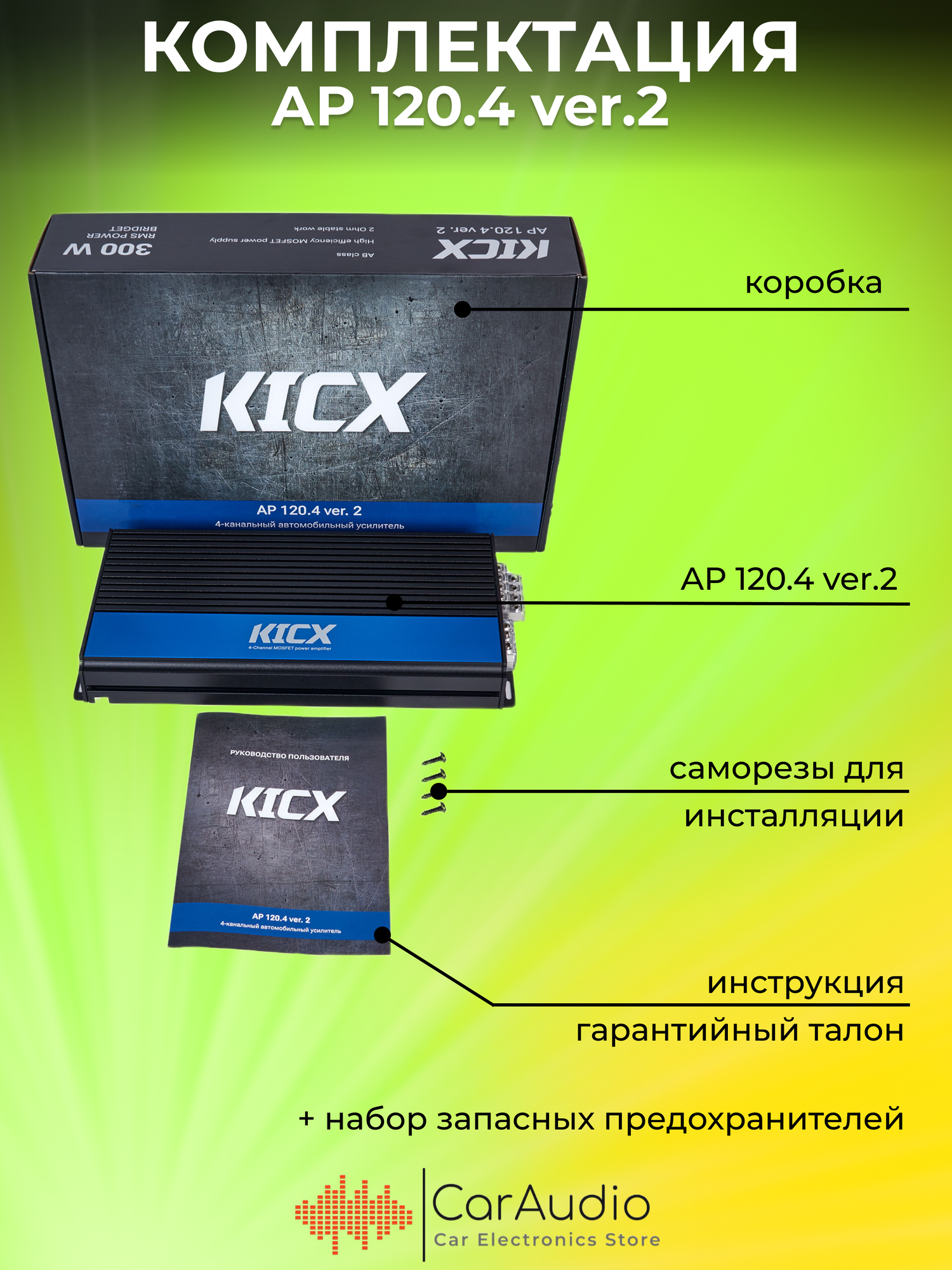 | Комплектация | Усилитель, коробка, инструкция,саморезы для инсталляции, набор запасных предохранителей. |